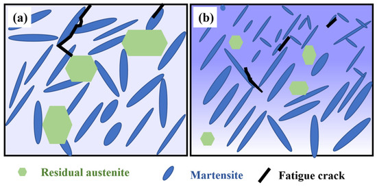 After EUSRP treatment, the surface grains of the sample were refined and exhibited gradient characteristics (Figure 12b). Additionally, the volume and size of residual austenite was reduced due to the stress-induced transformation. This phenomenon has been reported in Ref. [22]. The fine grains on the surface had a certain inhibitory effect on crack initiation, and the fatigue cracks of the rotary bending occurred near the surface of the sample, which is beneficial to the improvement of fatigue life.