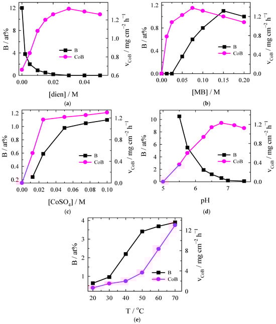 Figure 1a). The boron content in the coatings has been observed to decrease from 12 at% (without diethylenetriamine in the plating bath) to 0 at% as the diethylenetriamine concentration reaches 0.03 M or higher. This suggests that diethylenetriamine plays a crucial role in diminishing the boron content in the cobalt alloy films likely through its interaction with the cobalt(II)-dien complex. Boron does not co-deposit as part of the Co–B alloy because it is either oxidized or remains in solution due to the lack of sufficient reduction conditions for both cobalt and boron to exist simultaneously. The relationship between MB concentration and the cobalt alloy deposition rate is shown in