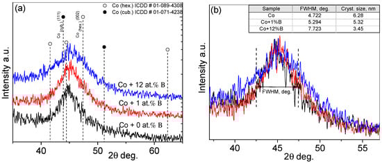 Figure 2b). The FWHM increases from 4.72 degrees without boron to 7.72 degrees with the addition of 12 at% boron. The width of the Co peak changes little when 1 at% of boron is added. However, the size of the Co crystallites forming the coatings, as calculated by the Halder-Wagner method, is only approximate since the calculations were complicated by the possible overlap of hexagonal and cubic Co structures within the coatings. Additionally, a more accurate estimate of the crystallite size requires a larger number of crystalline peaks of the compound. However, even these approximate calculations showed a decrease in the crystallinity of the Co coatings, from 6.3 nm to 3.4 nm, with the addition of boron.