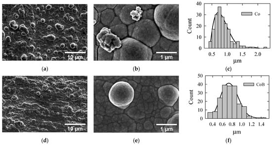 Figure 3e). It is evident that the incorporation of B into the Co coating results in denser, finer, and nodular surface morphology, as well as a decrease in grain size.