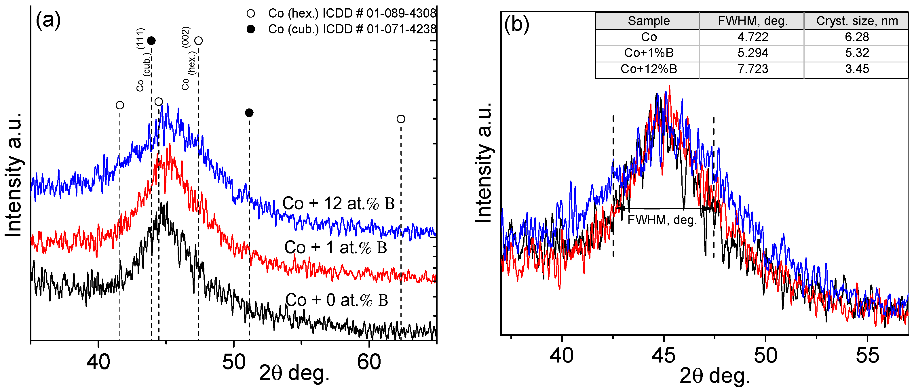 Figure 2b). The FWHM increases from 4.72 degrees without boron to 7.72 degrees with the addition of 12 at% boron. The width of the Co peak changes little when 1 at% of boron is added. However, the size of the Co crystallites forming the coatings, as calculated by the Halder-Wagner method, is only approximate since the calculations were complicated by the possible overlap of hexagonal and cubic Co structures within the coatings. Additionally, a more accurate estimate of the crystallite size requires a larger number of crystalline peaks of the compound. However, even these approximate calculations showed a decrease in the crystallinity of the Co coatings, from 6.3 nm to 3.4 nm, with the addition of boron.