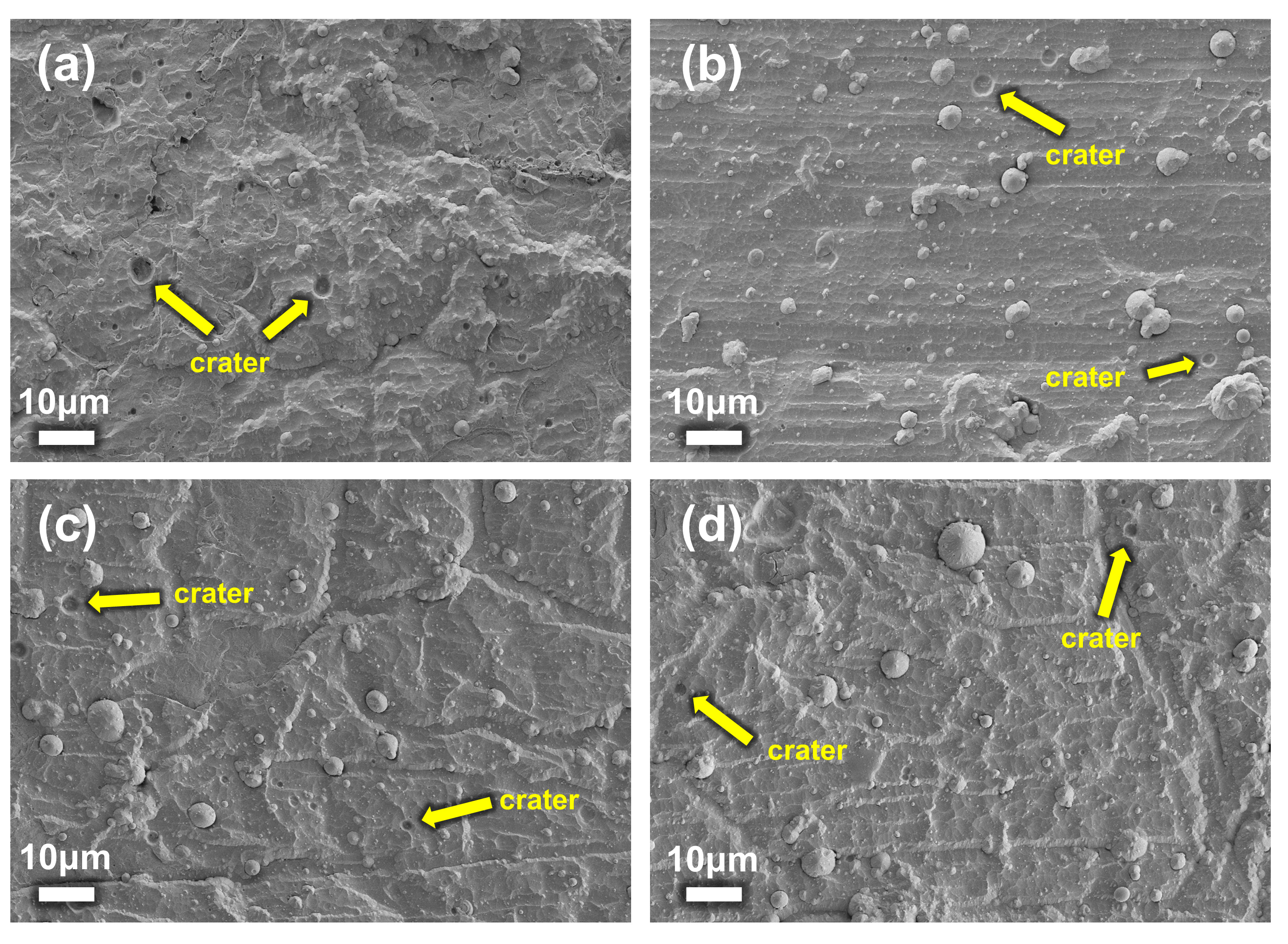 - As the chromium cathode arc current increases, the number and size of micro-particles on the coating surface gradually increase, accompanied by increased surface unevenness and a higher density of crater defects. At 65 A, the coating surface is primarily composed of small spherical particles with diameters less than 3 μm. When the current increases to 85 A, the particle size increases to 3–5 μm, and the coating becomes denser and uniform. However, at higher currents (105 A and 125 A), the micro-particles further coarsen, surface irregularities become more pronounced, elemental distribution becomes more uneven, and the number of craters increases.