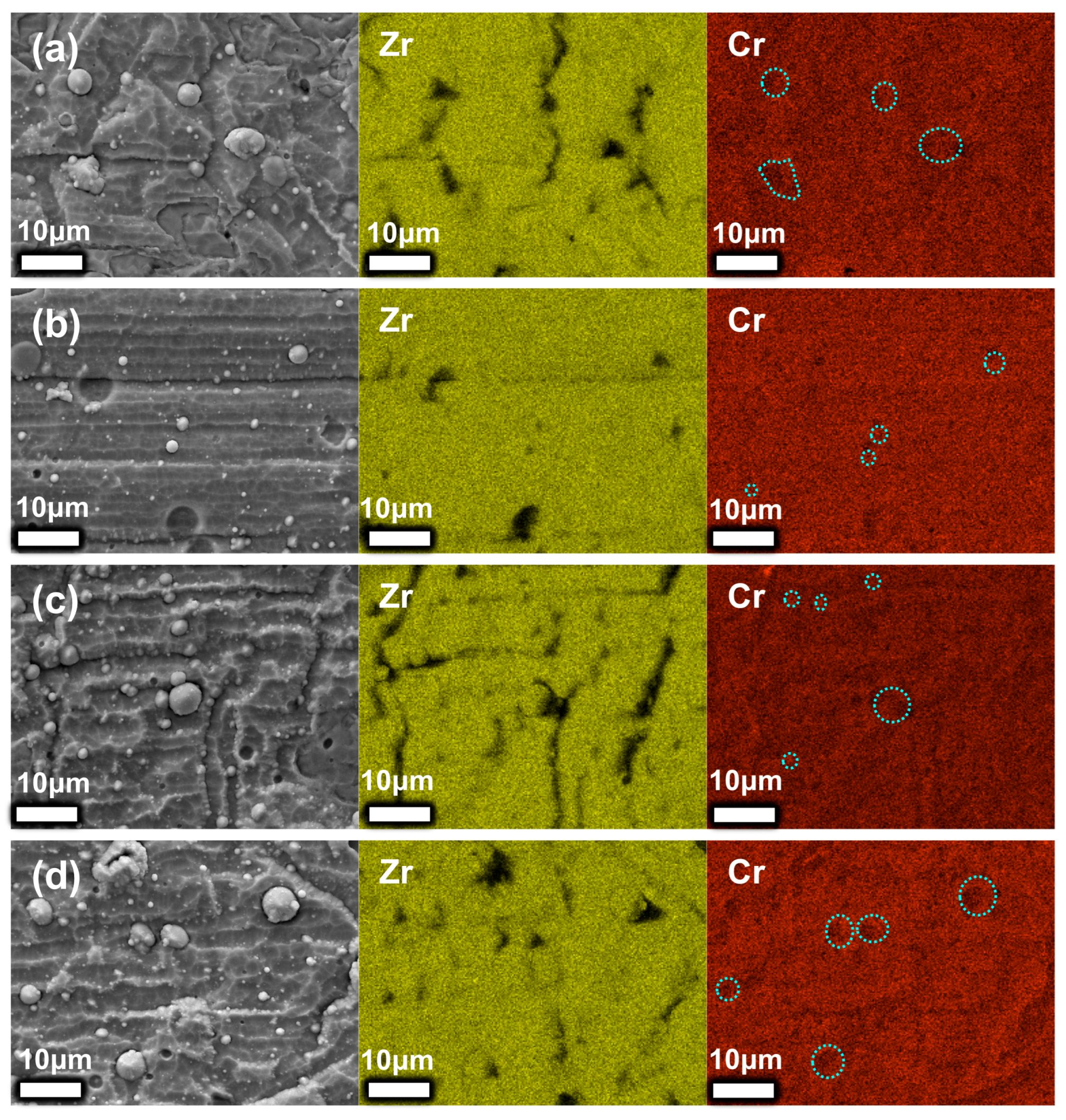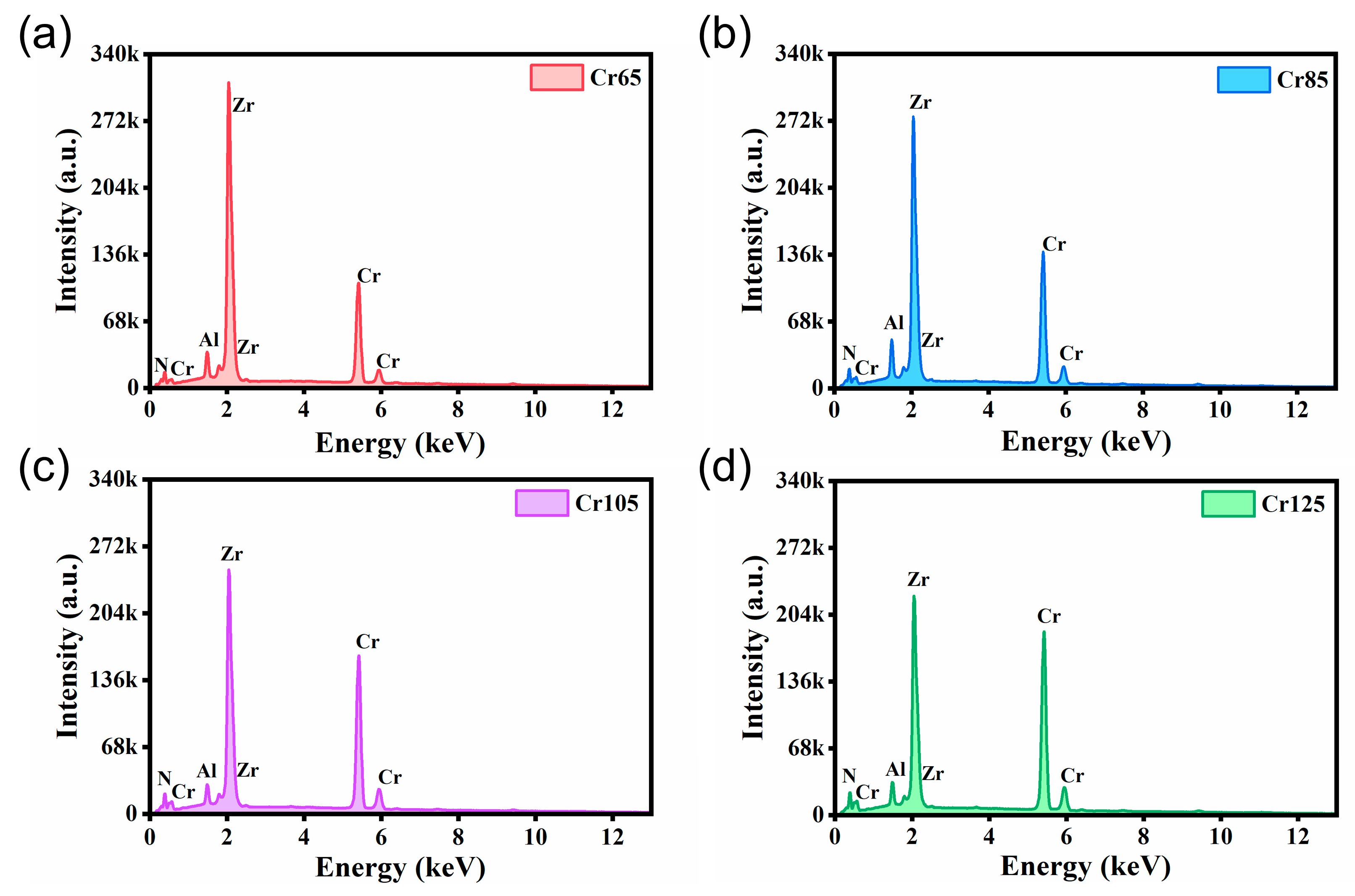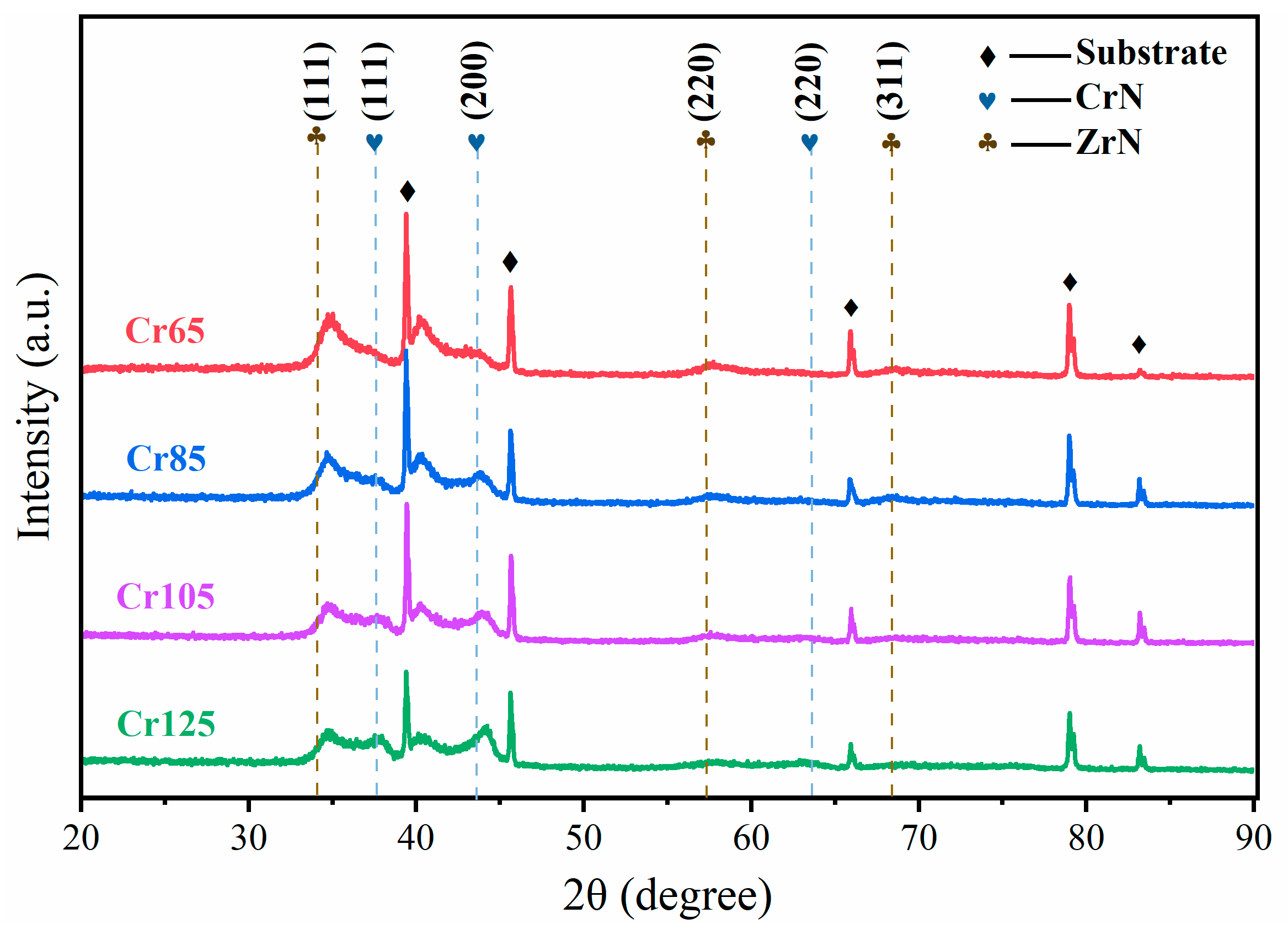- All coatings exhibit an NaCl-type B1 structure with the main crystal plane being (111). Changes in Cr doping concentration cause lattice constant variations, leading to low-angle shifts in XRD diffraction peaks, indicating the formation of solid solutions and lattice distortion between Zr and Cr.