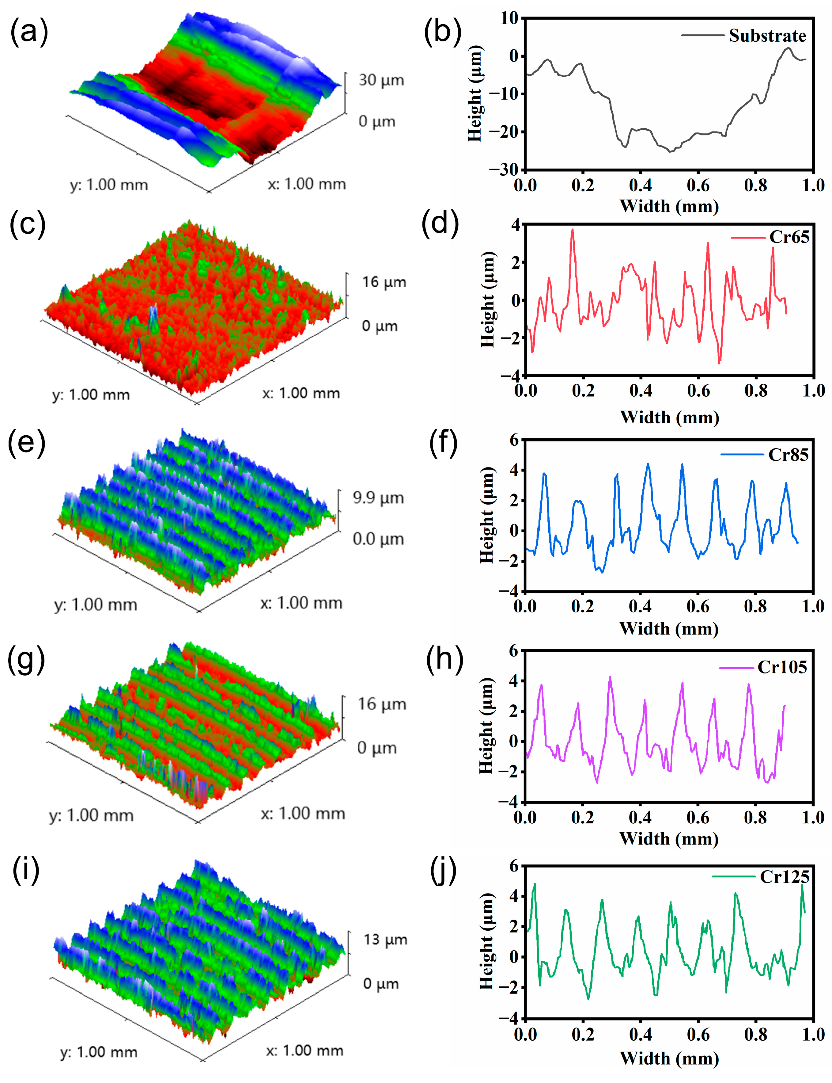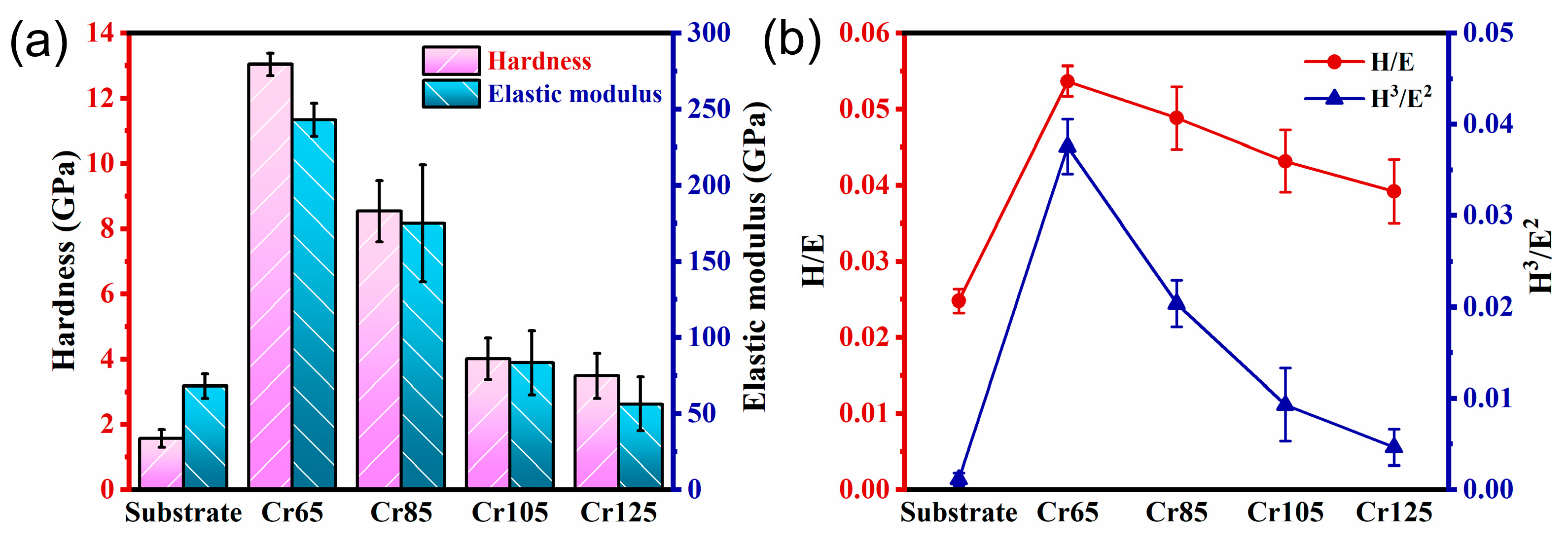- Nanoindentation test results show that the hardness of all coatings is significantly higher than that of the uncoated aluminum substrate. The Cr65 sample has the highest hardness (13.03 GPa) and elastic modulus (242.87 GPa), with the optimal H/E and H3/E2 ratios. Coatings deposited under low arc current exhibit high resistance to plastic deformation, while those deposited under high arc current have insufficient hardness and strength.