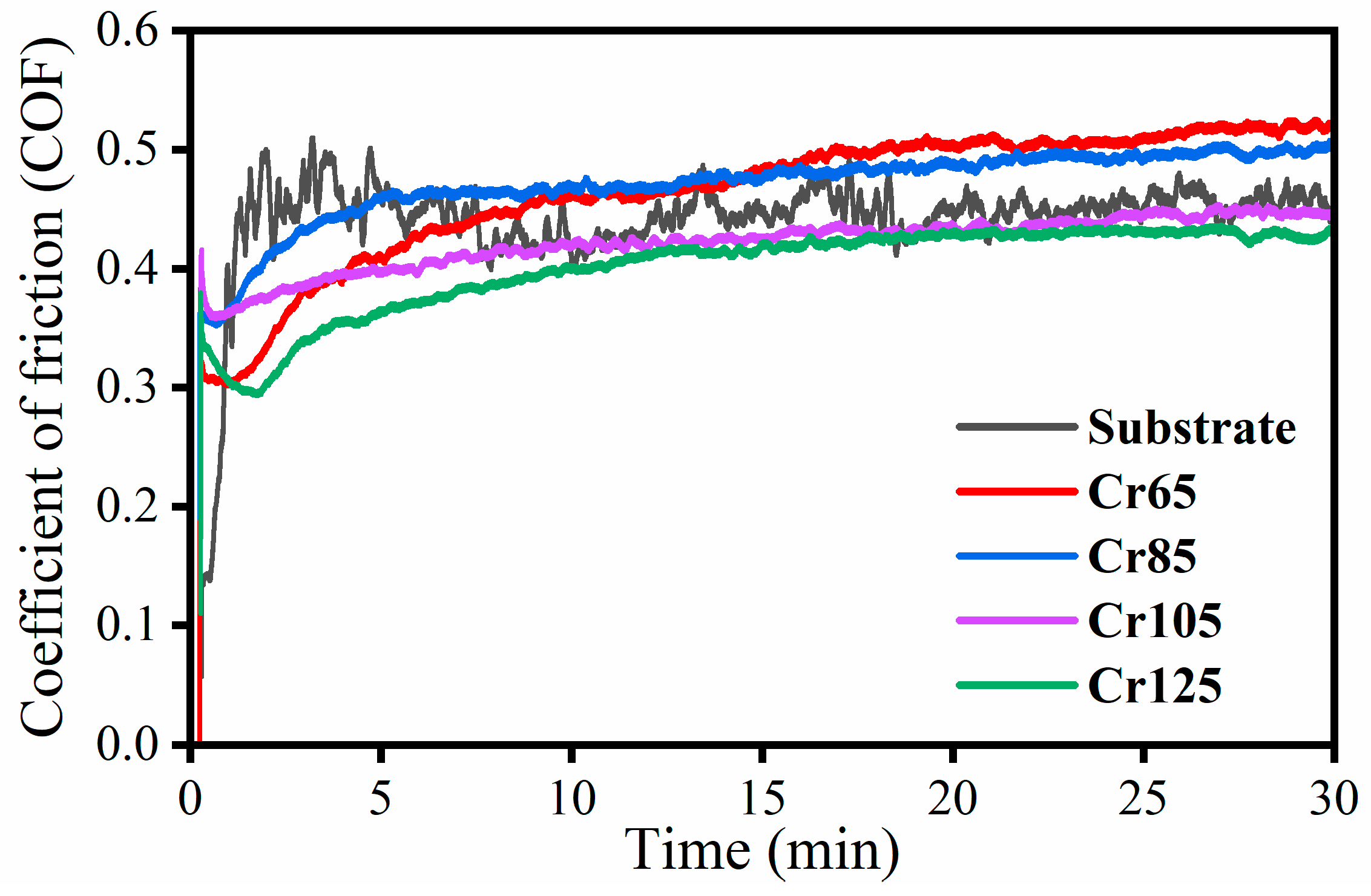- The Cr125 sample has the lowest COF (approximately 0.42), but its wear volume is relatively large (7.33 × 10−3 mm3). In contrast, the Cr85 sample maintains a low COF (approximately 0.48) while exhibiting the lowest wear volume (9.55 × 10−4 mm3) and a lower wear rate (5.31 × 10−5 mm3/N·m), demonstrating excellent wear resistance. Considering factors such as coating hardness, COF, wear volume, and wear rate, the coating prepared under 85 A conditions exhibits the best wear resistance performance.