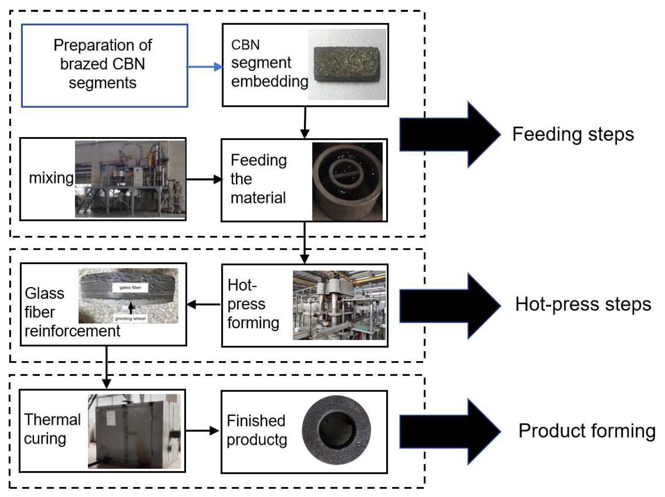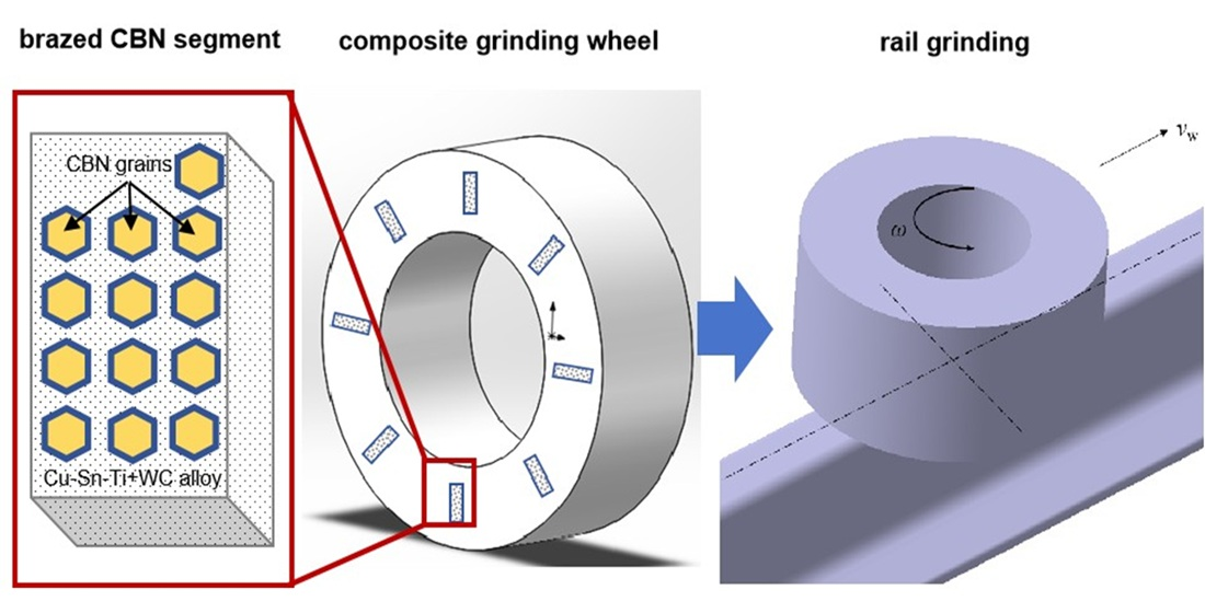 - To exploit the advantages of CBN superabrasives in machining rail materials, brazed CBN segments were embedded into the resin working layer to fabricate a composite grinding wheel. And the brazed CBN segments were produced using a Cu–Sn–Ti + WC composite filler alloy. Microstructural and phase analyses of the brazed CBN revealed that chemical metallurgical bonding was achieved between the Cu–Sn–Ti + WC composite filler and the CBN, with the formation of Ti–B and Ti–N phases. The introduction of WC reduced the excessive wetting aggressiveness of the filler alloy on CBN, enabling precise shape retention of the brazed CBN segments.