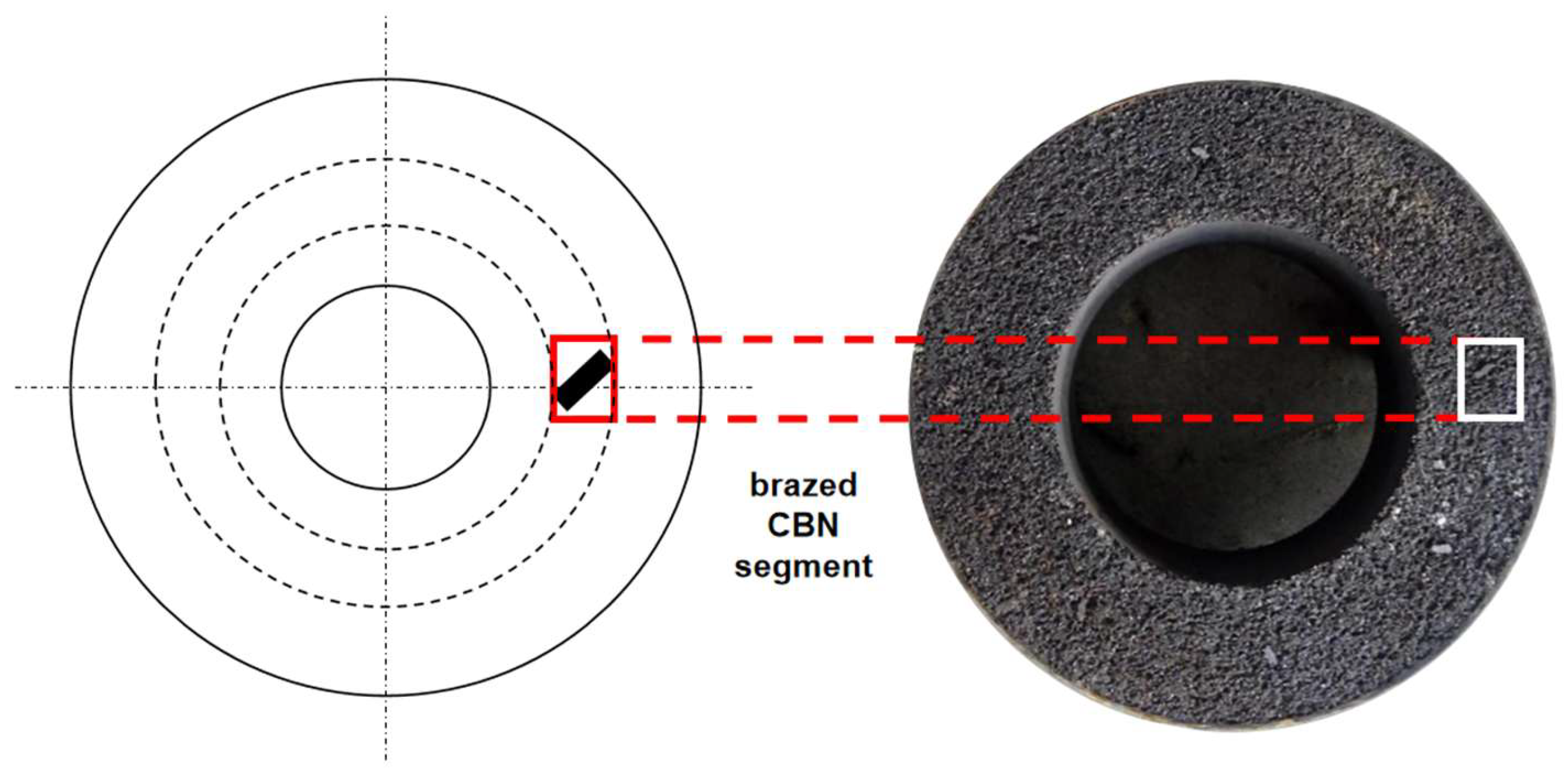 - Xiao, H.; Xiao, B.; Wu, H.; Xiao, B.; Yan, X.; Liu, S. Microstructure and mechanical properties of vacuum brazed CBN abrasive segments with tungsten carbide reinforced Cu–Sn–Ti alloys. Ceram. Int. 2019, 45, 12469–12475. [Google Scholar] [CrossRef]