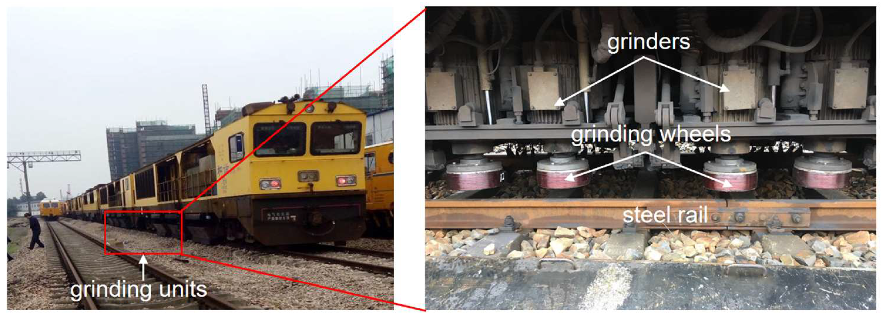 - You, J.; Zhang, W.; Cheng, Y.; Guo, M.; Zhan, S.; Duan, H.; Jia, D. Probing the self-adaptive grinding behaviours of high-speed rail grinding under the sliding-rolling composite motions. Tribol. Int. 2024, 205, 110473. [Google Scholar] [CrossRef]