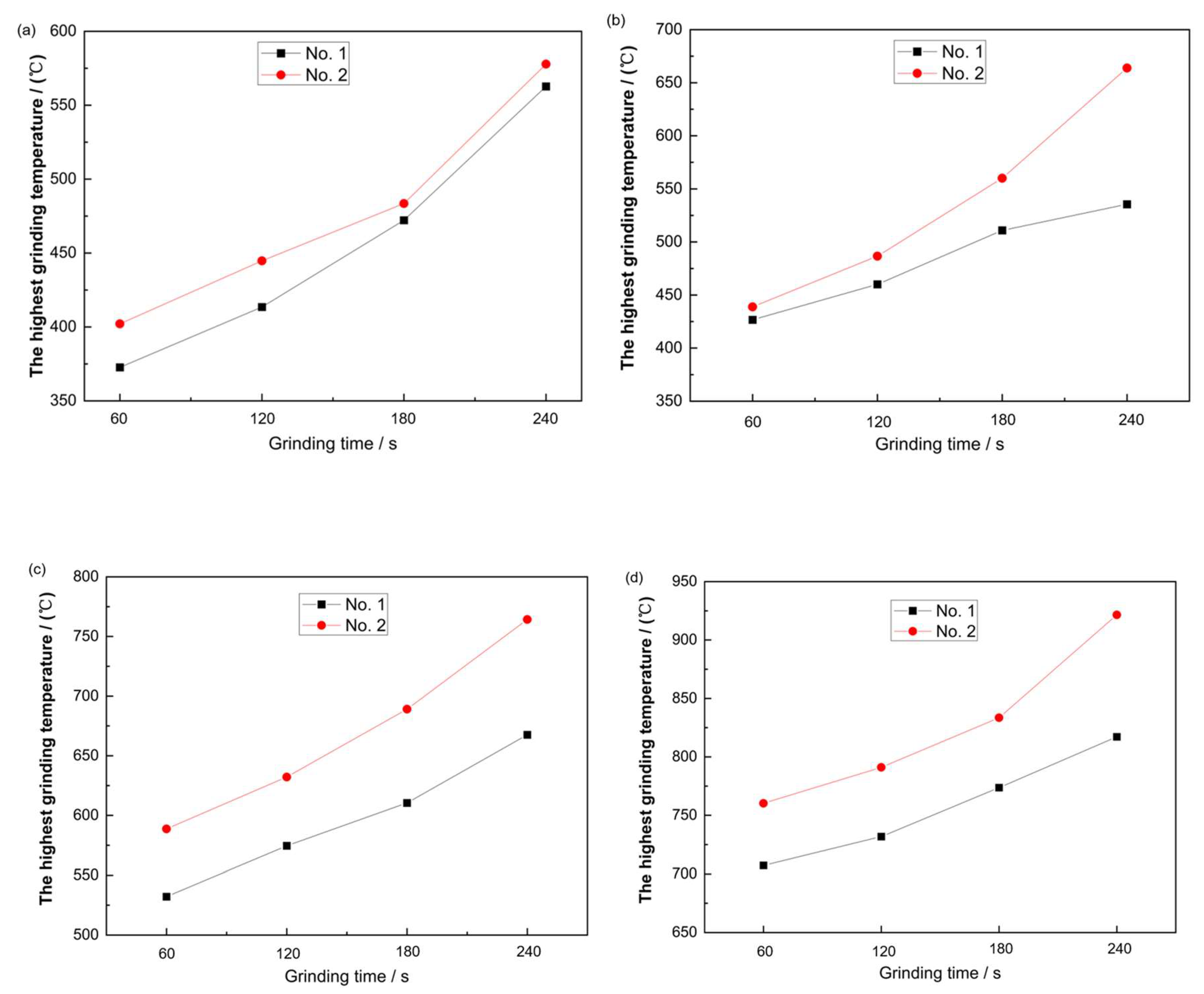 - Under all tested pressures, the grinding temperature of the novel composite wheel was lower than that of the resin-bonded wheel. Grinding with the composite wheel predominantly produced strip-shaped chips, with fewer spherical chips, and the oxygen content in the chips was relatively low. In contrast, grinding with the resin-bonded wheel generated a larger proportion of spherical chips with higher oxygen content. The elevated oxygen levels result from the reaction of Fe with O at high temperatures to form iron oxides, further confirming that the grinding temperature of the novel composite wheel is lower than that of the imported resin-bonded wheel.