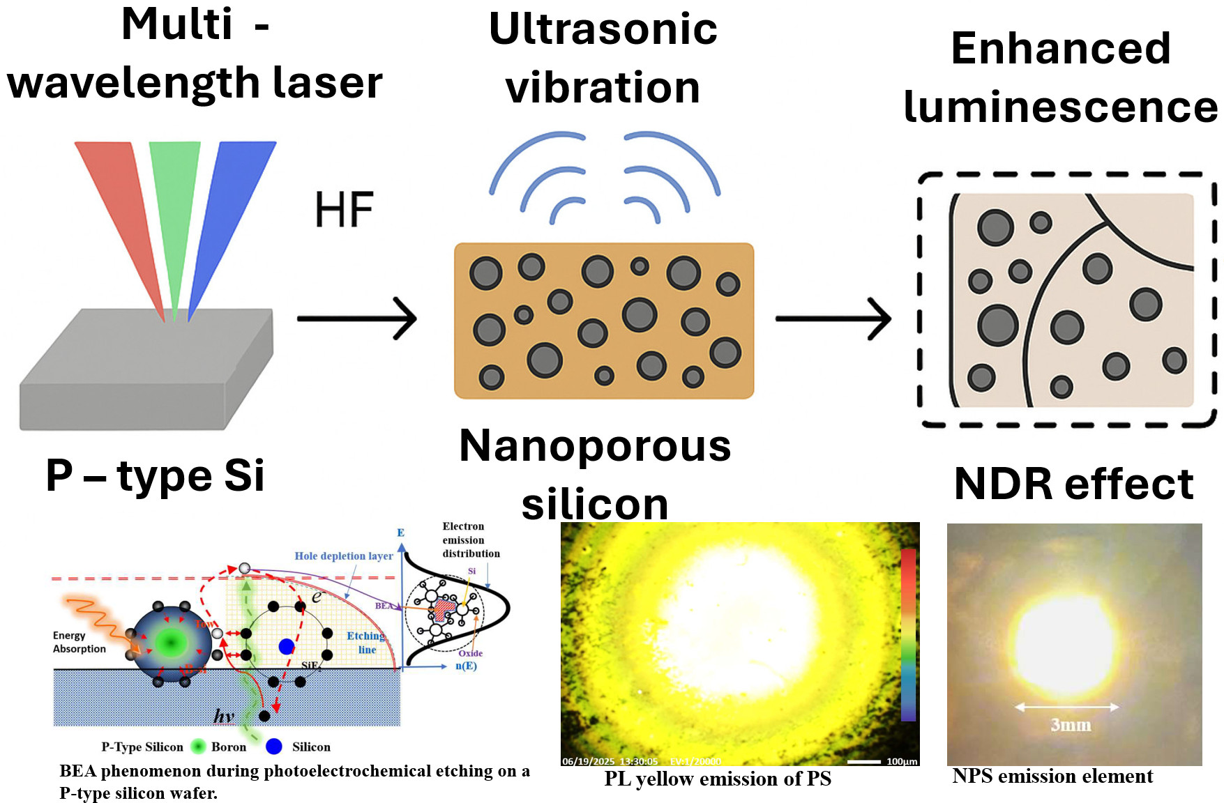 The steps of photoelectrochemical etching and wafer bonding for the fabrication of NC-PS diode components are detailed below. The photoelectrochemical etching process is designed to control the nanoscale porosity of the PS layer. The bonding of NC-PS involves the bonding of the P-type PS and the N-type wafer layers through H