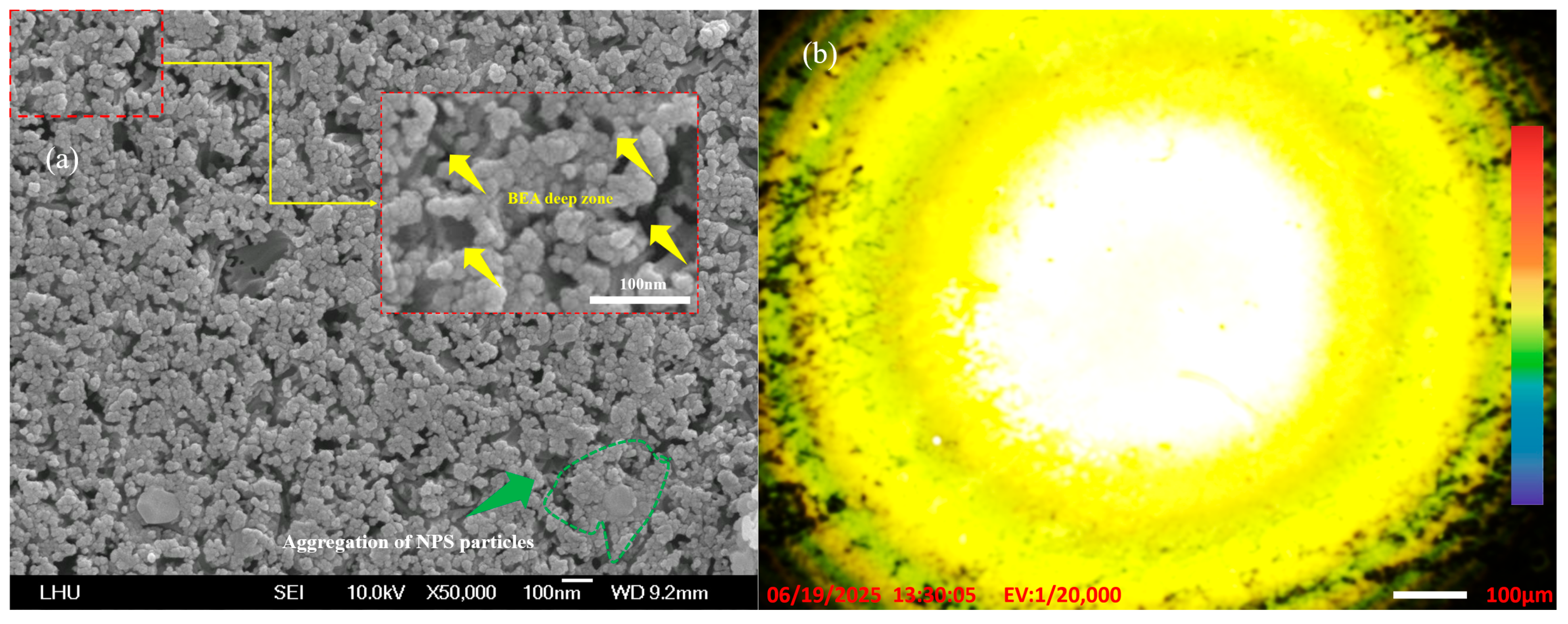 Figure 8b reveal the uniformity of the electron emission without distortion or noise. The findings demonstrate the advantages of using this novel PEEU process for the manufacture of optoelectronic light-emitting devices. It improves the emission characteristics of the prepared NPS samples, enhancing the PL characteristics of the NPS and improving emission efficiency, it can be applied to the manufacture. PL fluorescence microscopic observations of the BEA reaction area of the NPS sample show more uniform and stronger yellow light and green light emission areas, as illustrated in