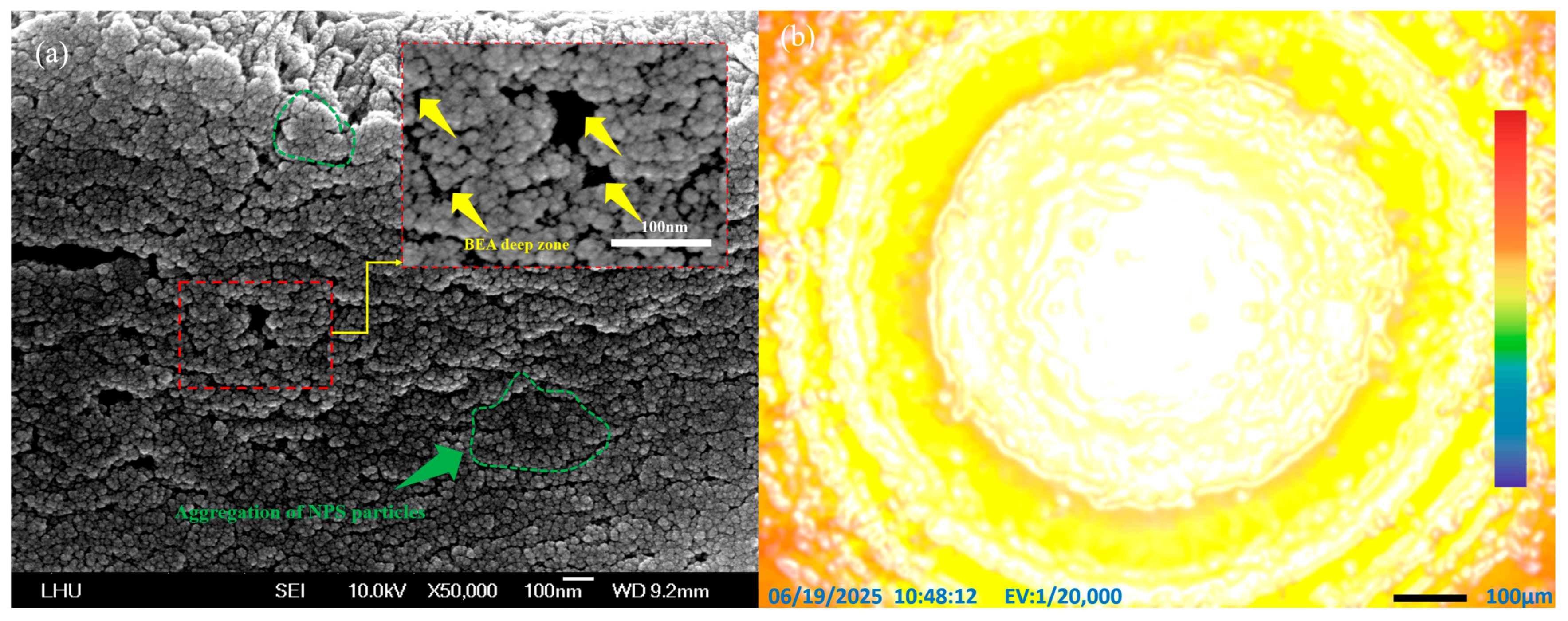This phenomenon can be regarded as a spatial extension of the BEA effect. The changes in PL luminescence intensity and wavelength reflect the gradient distribution of the nanostructure in the luminescent area. The red-light edge area may represent the existence of nanoholes with a weaker confinement effect in the BEA peripheral structure, which helps to estimate the size of the nanostructure and its distribution trend in the overall sample. These characteristics further verify the potential and accuracy of the PEEU process in preparing NPS structures with high uniformity and controllability. To further improve the uniformity of the nanostructure distribution and suppress the appearance of red-light emission in the edge area, further measurements are required. A critical aspect to address is the spatial energy distribution profile of the laser light source, which must be considered. Since the laser light has a Gaussian intensity distribution, the radiation energy is higher in the center area, gradually weakening towards the edge. This can easily induce different formation conditions in different areas of the sample, resulting in a slight unevenness in the nanostructure. The Gaussian distribution of the laser can be adjusted or flattened using optical filters or a beam conversion optical design to achieve more uniform illumination, thereby improving the stability of the structure and luminescence characteristics. This occurrence confirms that the BEA region on the NPS surface is affected by quantum confinement effects, which depend on the size and aggregation ratio of the nanostructures on the surface. However, these nanostructures can be more precisely controlled through the PEEU process. The agglomeration of PS particles is evident in the FE-SEM images, as outlined by green in