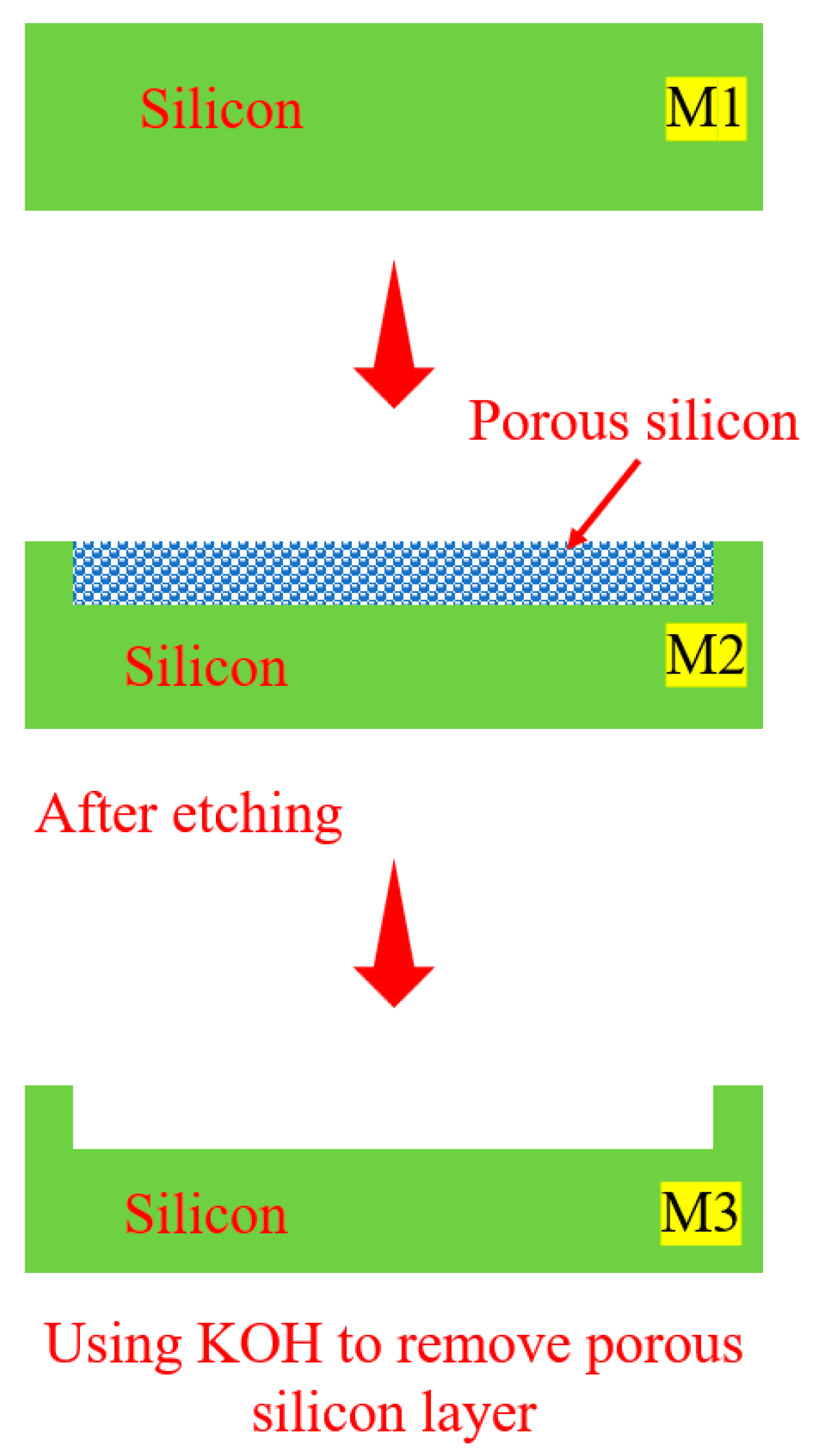 Porosity (p%) is the ratio of the volume of voids in a material to the total volume. It can be calculated indirectly from the change in sample mass. For quantitative analysis, the porosity is calculated based on the sample mass before (M1), and after etching (M2), and after removal of the porous layer with potassium hydroxide (KOH) (M3), as shown in Equation (8) [