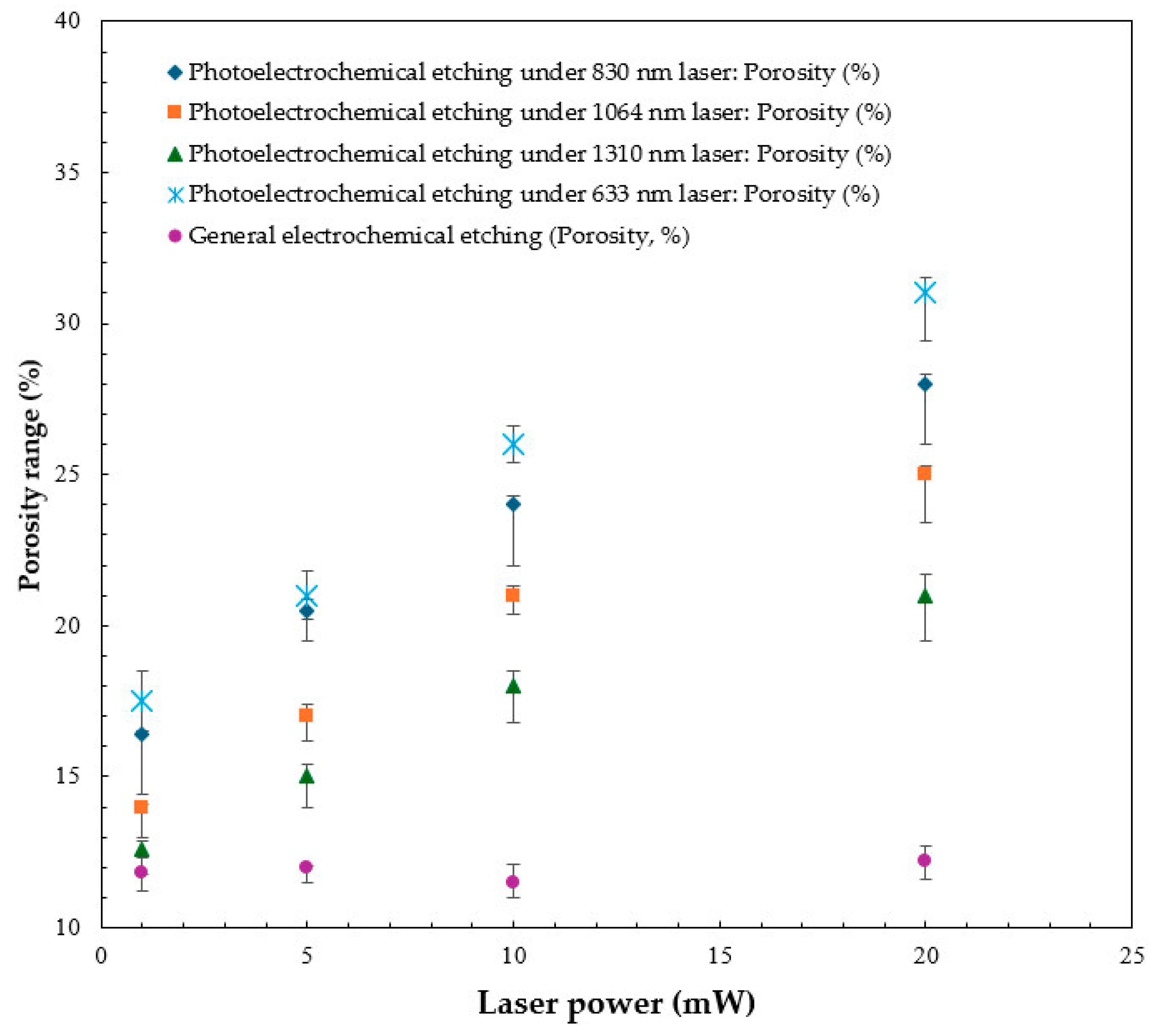 Table 1. The results show an increase in the porosity with the laser power during photoelectrochemical etching. Experimental findings confirm that, under the same power conditions, the porosity generated by a 633 nm laser is always higher than that of other wavelength lasers (830 nm, 1064 nm, 1310 nm). As the power increases, the difference between porosity and other wavelengths gradually expands, as shown in