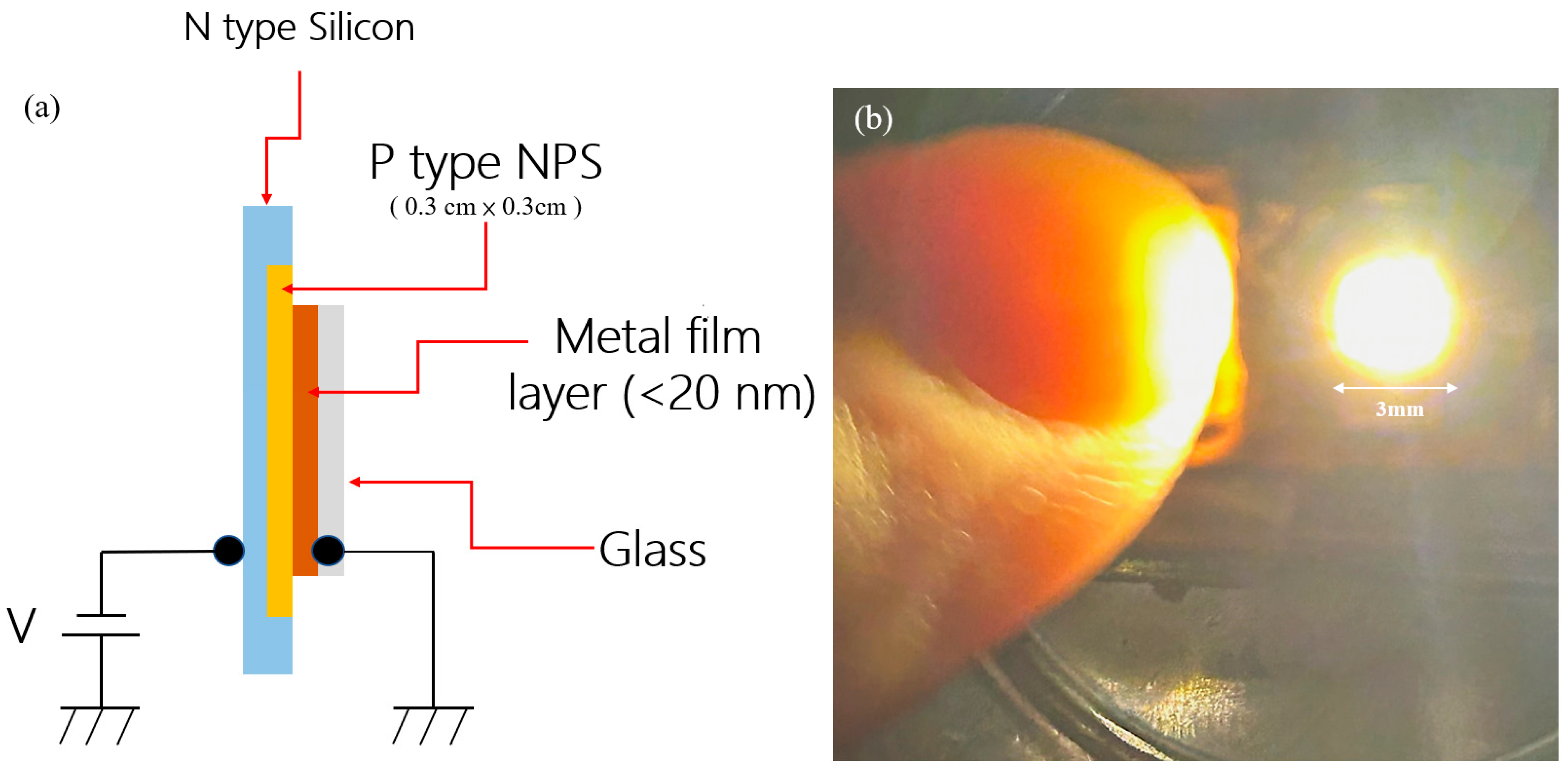 Figure 11a, from top to bottom: P-type NPS, N-type Silicon Substrate, metal film layer (<20 nm), and glass Substrate. The surface electrode material is gold (Au), with the layer thickness controlled below 20 nm. This thin film layer allows both conductive and partial light transmittance, which is conducive to the measurement of electroluminescence and I–V characteristics. In this structure, the N-type silicon substrate (blue block) serves as the supporting platform of the entire device and provides the electron source. It forms a PN heterojunction with the upper P-type NPS layer, which is the key to carrier injection and the establishment of a built-in electric field.