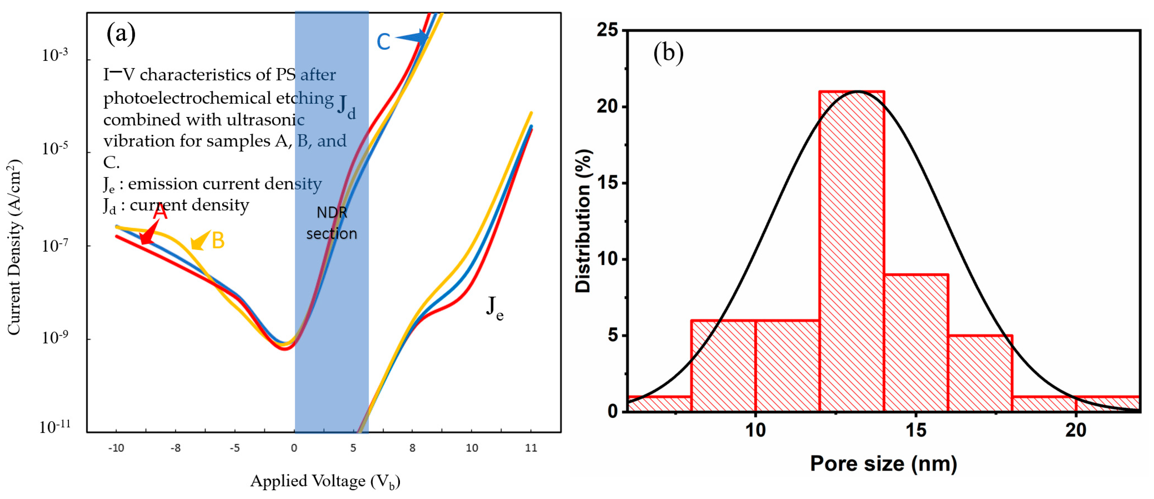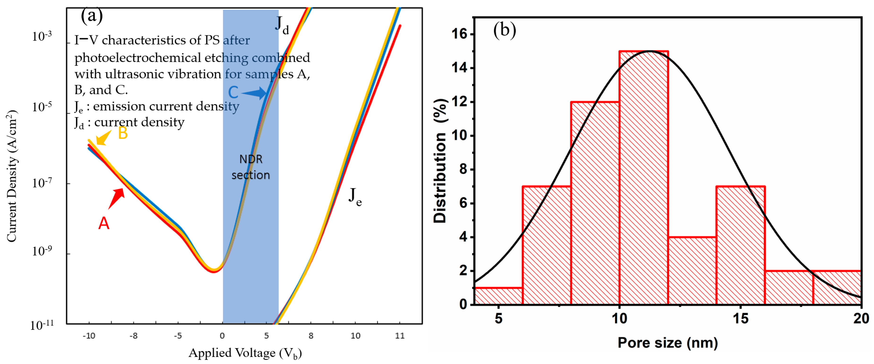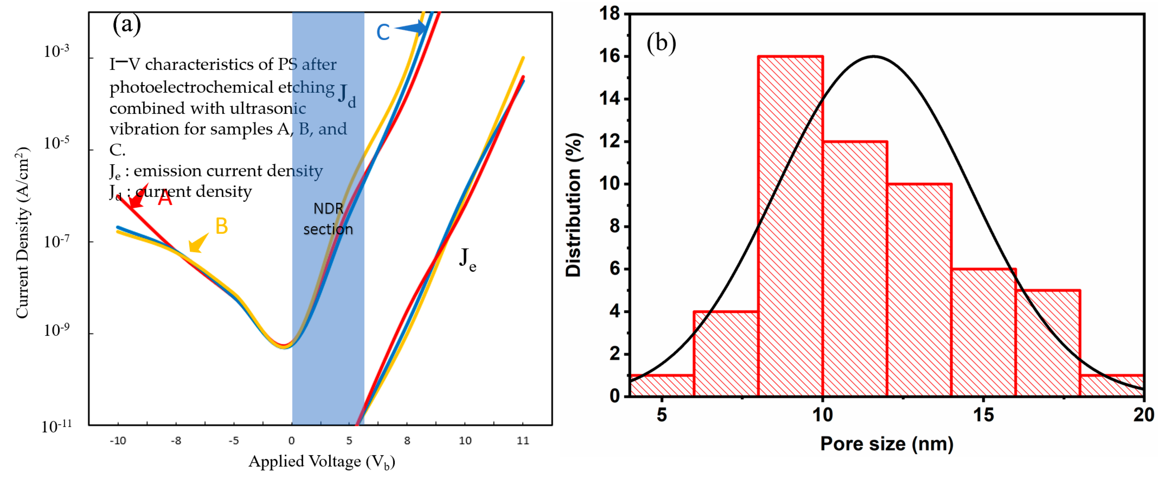 d) of the device in the subsequent PS diode current-voltage characteristic test (I–V Tester). This means that, with a decrease in the pore size and porosity of the PS structure, electron injection in the emission current density (J