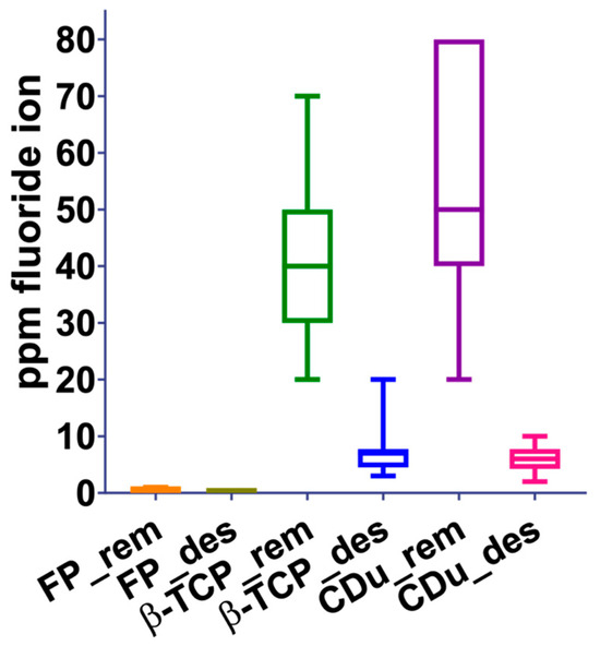 During the 15-day pH cycle, the amount of the fluorine element (ppm) in the demineralizing and remineralizing solutions was measured daily using the ISE-F. The results obtained did not have a normal distribution, and the median value was considered as presented in (Chi2 = 105.1, DF = 6, p < 0.05). Figure 1 shows the box and whisker plot of the ISE-F measurements results during the 15 days of cyclical pH treatment with the different experimental groups, where statistically significant differences are observed. (*) (p < 0.05).