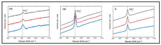 Raman spectra of Hydroxyapatite (HA), Healthy Enamel (HE), and Initial Lesion (IL) groups. This figure presents three representative spectra for each group. The characteristic band for the PO43− group is centered at 956 cm−1. The black, red, and blue spectra correspond to specific dental samples after the application of remineralizing protective varnishes. The spectra have been vertically offset in arbitrary units to improve visualization.