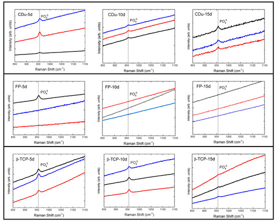 Raman spectra of enamel surfaces after treatment with remineralizing protective varnishes (CDu, FP, and β-TCP-F). In some of the treatments, the specific vibrational band corresponding to the detection of the phosphate functional group is detected at approximately 960 cm−1. The black, red, and blue lines correspond to representative zones measured from each sample. These recordings are separated on the Y axis by arbitrary units for improved visualization. The Functional group (PO43−) at 956 cm−1 was measured on days 5, 10, and 15 post-treatments. Notably, the detection of this group decreases by day 15, which we attribute to a physical insulating effect caused by the thickness of the FP and β-TCP-F varnishes.