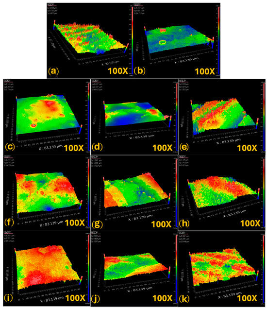 Representative optical profilometry images of each sample: (a) healthy enamel (HE); (b) initial lesion (IL); (c) FP, 5-day treatment; (d) FP, 10-day treatment; (e) FP, 15-day treatment; (f) β-TCP-F, 5-day treatment; (g) β-TCP-F, 10-day treatment; (h) β-TCP-F, 15-day treatment; (i) CDu, 5-day treatment; (j) CDu, 10-day treatment and (k) CDu, 15-day treatment.