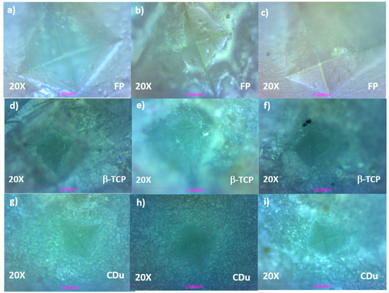 Vickers hardness was measured using a load of 10 N, equivalent to 1019 g force (Figure 5). The specimens were mounted on glass slides using epoxy resin to ensure proper fixation and avoid unwanted movement during testing. Subsequently, the working surface was selected by identifying areas with minimal convexity to facilitate precise and reliable indentation. Panels a–c in Figure 5 correspond to the FP group after 5, 10, and 15 days of treatment, respectively. The indentations display well-defined rhomboid geometries, suggesting improved mechanical resistance over time. Panels d–f show the β-TCP group at the same time intervals. The rhomboid indentations are less distinct, indicating intermediate levels of enamel remineralization. Panels g–i depict the CDu group. The indentations appear more diffused and less sharply defined, particularly at day 10 (h), which may reflect variability in surface hardness or light scattering due to surface roughness.