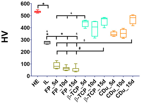 The results were non-parametric, and the median was used to determine the hardness of the healthy enamel group (HE = 533.8 ± 3.12 HV), which was significantly reduced after the initial demineralizing lesion (IL = 281.0 ± 4.1 HV) (Figure 6). The hardness of the FP group was unexpectedly very low: 80 ± 9.3, 62.50 ± 6.15, and 40 ± 8.30 at 5, 10, and 15 days, respectively. Residual varnish was likely present during testing. Meanwhile, the group treated with β-TCP showed a median of 448.2 ± 9.82 at 5 days; 406.3 ± 22.09 at 10 days; and 473.6 ± 12.78 at 15 days. The group treated with CDu had medians of 344.5 ± 6.28, 352.5 ± 11.66, and 483.0 ± 13.00 at 5, 10, and 15 days, respectively, with a p-value < 0.05.