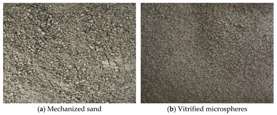 The water, P•O 42.5 ordinary Portland cement, manufactured sand, and expanded glass beads used in this study were all supplied by Hezhou Guangsha Environmental Protection Co., Ltd. (Hezhou, China). The physical properties of the water, P•O 42.5 ordinary Portland cement, manufactured sand, and expanded glass beads are presented in Table 1, Table 2, Table 3 and Table 4, respectively. Representative appearances of the manufactured sand and expanded glass beads are shown in Figure 1a,b.