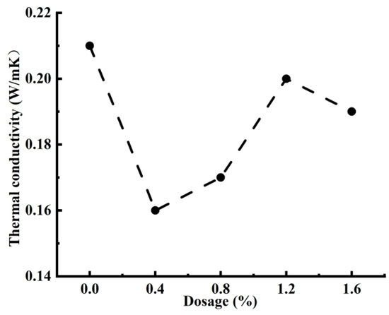 For the 0.8% dosage group, the thermal conductivity was measured at 0.17 W/(m·K), a 19.0% reduction relative to the control, indicating that good insulation performance was still maintained. When the dosage increased further to 1.2%, the thermal conductivity rose to 0.20 W/(m·K), approaching the baseline value. This suggests that fiber agglomeration and heterogeneity in the pore structure compromised the original thermal resistance system, thereby weakening the insulating effect. At 1.6% dosage, the thermal conductivity slightly decreased to 0.19 W/(m·K), but the improvement was limited, with only a 9.5% reduction compared to the control.