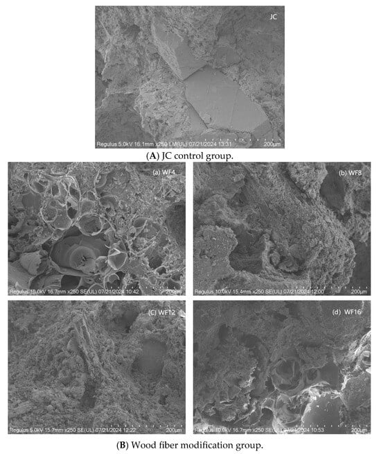 As shown in Figure 11B, the incorporation of wood fibers induced pronounced changes in the microstructure of lightweight mortar. The SEM images reveal that the fibers formed a highly porous, honeycomb-like network within the matrix, with considerable internal porosity. These honeycomb structures markedly enhanced the thermal insulation performance of the mortar. During the hydration curing process, the inherent porosity and strong hydrophilicity of the fibers allowed them to absorb large amounts of mixing water at early stages, leading to swelling. Subsequently, as the fibers gradually released water, shrinkage occurred. This “swelling–desorption” cycle generated numerous irregular voids and macropores around the fibers. Moreover, the rough surface and irregular cross-sections of the fibers further promoted the formation of pores. Collectively, these structural features optimized the internal pore distribution, effectively suppressing heat conduction and thereby improving thermal insulation performance.
