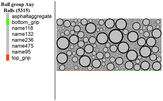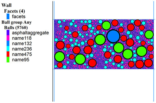 As illustrated in Figure 2, the ‘walls’ in the model are represented by blue lines, while the coarse aggregates of the same gradation are grouped into a total of five categories. Specifically, group 118 represents coarse aggregates with particle sizes ranging from 1.18 mm to 2.36 mm; group 132 represents aggregates ranging from 13.2 mm to 16 mm; group 236 corresponds to aggregates ranging from 2.36 mm to 4.75 mm; group 475 refers to aggregates ranging from 4.75 mm to 9.5 mm; and group 95 denotes aggregates ranging from 9.5 mm to 13.2 mm. Additionally, the fine aggregates and asphalt binder are categorized as group asphalt aggregate with particles sizes smaller than 1.18 mm. For the convenience of analysis, the colors of each group of particles are adjusted to gray in the subsequent sections.
