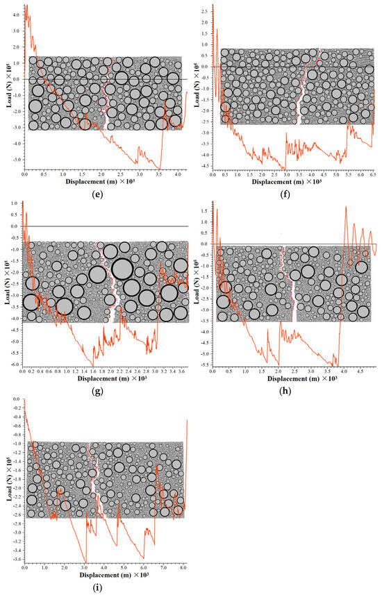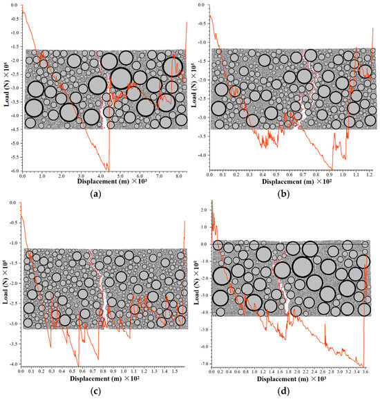 The study [17] established 3D models for AC13 and SMA13 mixtures based on the DEM. The simulation results indicated that AC13 exhibited a slightly higher peak load and a relatively smaller maximum displacement compared to SMA13, which aligns closely with the findings of this study. It should be noted that the study [17] employed a three-dimensional modeling approach, whereas this paper utilizes a two-dimensional model. Furthermore, the aggregate model in study [17] was constructed based on actual morphological features, while this study adopts circular particles to represent coarse aggregates in order to simplify the computational model. These differences may account for the discrepancies observed in the simulation results. The study [15] investigated the fracture behavior of asphalt mixtures using semi-circular bending tests and found that mixtures containing large-sized aggregates demonstrate superior crack resistance. This is attributed to the fact that during crack propagation, cracks tend to bypass large particles, leading to an elongated, more tortuous crack path and greater energy dissipation. This phenomenon is consistent with the results observed in this study, where LSPM30 exhibited significantly higher maximum tensile displacement on the load/displacement curve compared to AC13 and SMA13.