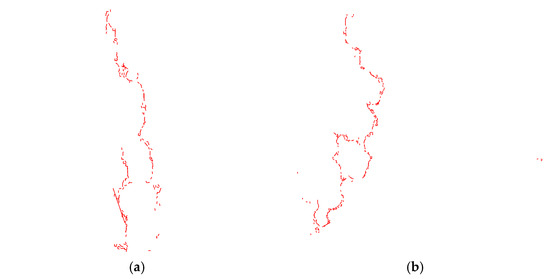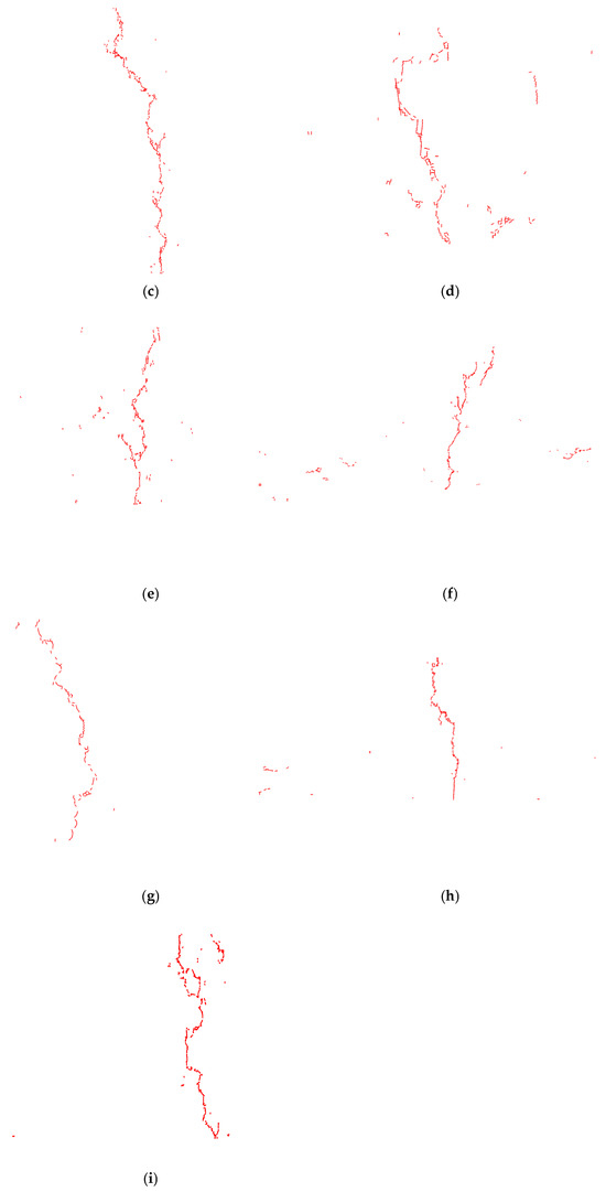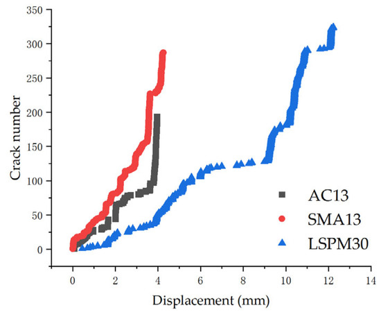 Figure 11 presents the relationship between the number of cracks and displacement for the three types of asphalt mixtures. As shown in Figure 11, SMA13 exhibits a clear linear relationship between crack count and displacement, primarily involving two stages: linear crack propagation and fracture. In contrast, the crack/displacement relationship for LSPM30 and AC13 consists of three distinct stages: linear crack propagation, a plateau phase, and final fracture. It can be observed that the maximum tensile displacement of AC13 and SMA13 is comparable but significantly lower than that of LSPM30. The number of cracks in LSPM30 is slightly higher than in SMA13, while the number of cracks in SMA13 is significantly greater than in AC13. This suggests that LSPM30 demonstrates a superior capacity for inhibiting crack propagation.
