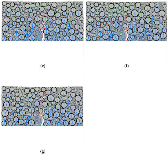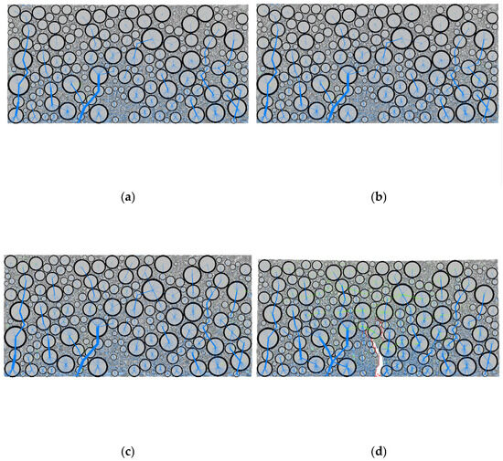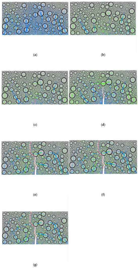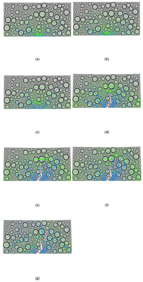 As shown in Figure 7, the content of coarse aggregates in SMA13 is relatively high, and the distribution of coarse aggregates is more uniform. Prior to reaching the peak load, the dominant force chain within the specimen is the compressive chain. These compressive chains primarily develop between the coarse aggregates, forming multiple force chains extending from the bottom to the top of the specimen. Following crack initiation, the tensile chains undergo significant changes. As the cracks propagate, the compressive force chains are transmitted along the coarse aggregate particles, resulting in the formation of multiple load-transfer paths extending from the bottom to the top of the specimen. From Figure 6 and Figure 7, it can be seen that compressive chains predominantly exist and propagate between coarse aggregate particles, suggesting that the internal distribution of coarse aggregate particles significantly influences the force field within the specimen.