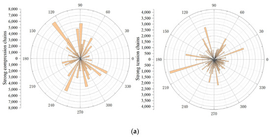 As illustrated in Figure 10, the contact forces between coarse aggregates in the AC13, SMA13, and LSPM30 asphalt mixtures under peak load conditions were analyzed separately, and the corresponding strong compressive and tensile force chains were extracted. It can be observed from Figure 10 that the number of strong tensile and compressive force chains is relatively small overall; however, the magnitudes of both tensile and compressive forces are significant, with the compressive force amplitude being greater than that of the tensile forces. This suggests that inter-particle compressive forces play a dominant role in transmitting and sustaining external loads within asphalt mixtures. The distribution patterns of strong compressive force chains in the three asphalt mixtures exhibit an “8”-shaped configuration. In AC13, the strong compressive force chains are predominantly oriented at approximately 60°–130° and 240°–330°, whereas in LSPM30, they are mainly distributed at approximately 130°–240° and 90°–300°. In SMA13, the strong compressive force chains are concentrated at approximately 45°–120° and 210°–300°. The distribution of strong tensile force chains in SMA13 also displays an “8”-shaped pattern, while those in LSPM30 and AC13 do not exhibit distinct directional characteristics. In LSPM30, the tensile force chains are primarily oriented in the horizontal direction, whereas in AC13, they are more uniformly distributed. Based on the distribution of strong tensile and compressive force chains, it can be inferred that the coarse aggregate arrangement in SMA13 is relatively uniform, enabling the formation of a more effective skeleton structure, which facilitates the transmission of external loads within the asphalt mixture. In contrast, the coarse aggregate distribution in AC13 is less uniform and characterized by a lower overall content, resulting in a reduced capacity to transmit external loads. LSPM30 demonstrates intermediate behavior between the AC13 and SMA13.