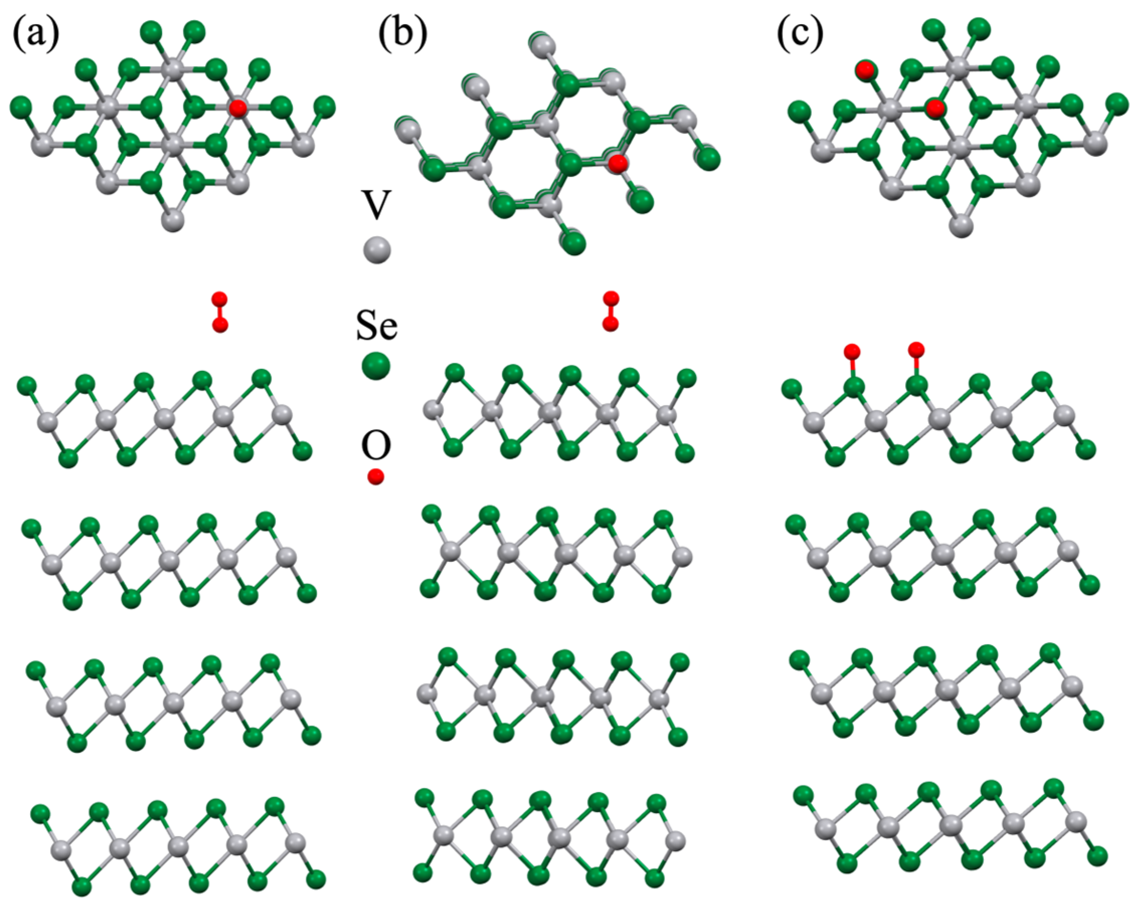 - Edla, R.; Kuo, C.N.; Torelli, P.; Lue, C.S.; Boukhvalov, D.W.; Politano, A. Interaction of VSe2 with ambient gases: Stability and chemical reactivity. Phys. Status Solidi (RRL) 2022, 14, 1900332. [Google Scholar] [CrossRef]
