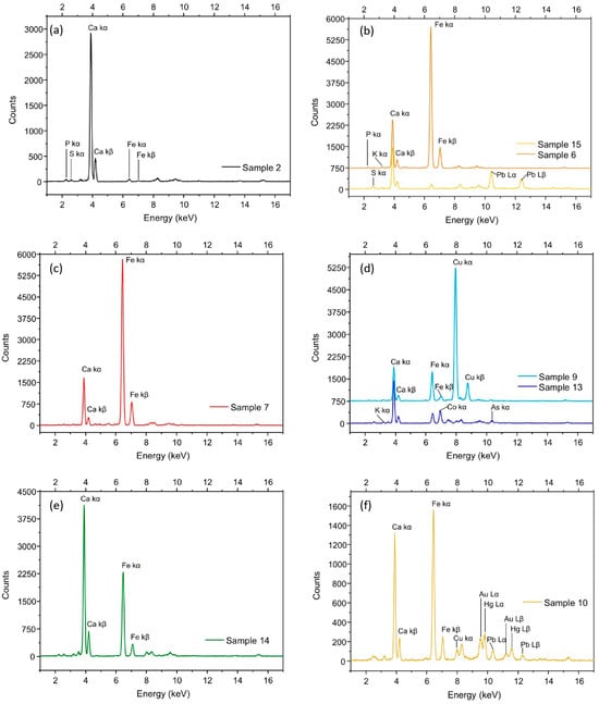 XRF spectra acquired on The Marriage of the Virgin: (a) the white area corresponding to sample 2, (b) the yellow areas corresponding to samples 6 and 15, (c) the red area corresponding to sample 7, (d) the blue areas corresponding to samples 9 and 13, (e) the green area corresponding to sample 14 and (f) the golden area corresponding to sample 10.