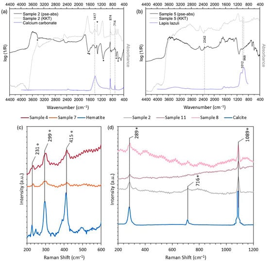 ER-FTIR spectra in external reflection mode (black) and after KKT correction (grey) acquired on The Marriage of the Virgin for: (a) the white area corresponding to sample 2, with marker bands for calcium carbonate (dotted lines), for gypsum (asterisks) and for oxalates (triangles), reference spectrum of calcite (blue) is shown for comparison; (b) the blue area corresponding to sample 5, with marker bands for lapis lazuli (dotted lines), reference spectrum of lapis lazuli (blue) is shown for comparison. Raman spectra of (c) samples 4 and 7 showing the presence of hematite (open circles) and of (d) samples 2, 8 and 11 showing the presence of calcite (asterisks), reference spectra of hematite and calcite are shown for comparison. The reference spectra displayed in each graph are taken from the laboratory’s internal database.