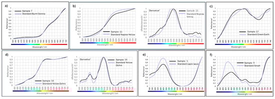 Spectra obtained by visible reflectance analyses of The Marriage of the Virgin fresco, compared to the respective normalised spectra of the standard pigments of the following analyzed points: (a) sample 7 localized on a red area, (b) sample 15 localized on a yellow area, (c) sample 17 localized on a green area, (d) sample 14 localized on a green area, (e) sample 5 localized on a blue area and (f) sample 9 localized on a blue area.
