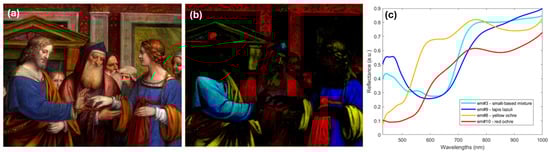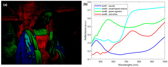 In this fresco, similarly to The Marriage of the Virgin, a difference in the blues used for Mary’s and Joseph’s mantles can be observed. The light blue endmember suggests the presence of a smalt-based paint mixture in lighter areas, as previously reported for the other fresco. In Mary’s mantle, a second blue spectrum reported in Figure 11b exhibits a different spectral response, characterized by a reflection minimum at 640 nm and a lower reflectance in the red and near-infrared, which is indicative of azurite pigment rather than lapis lazuli [36,42], as shown in the spectra in Figure 11b.