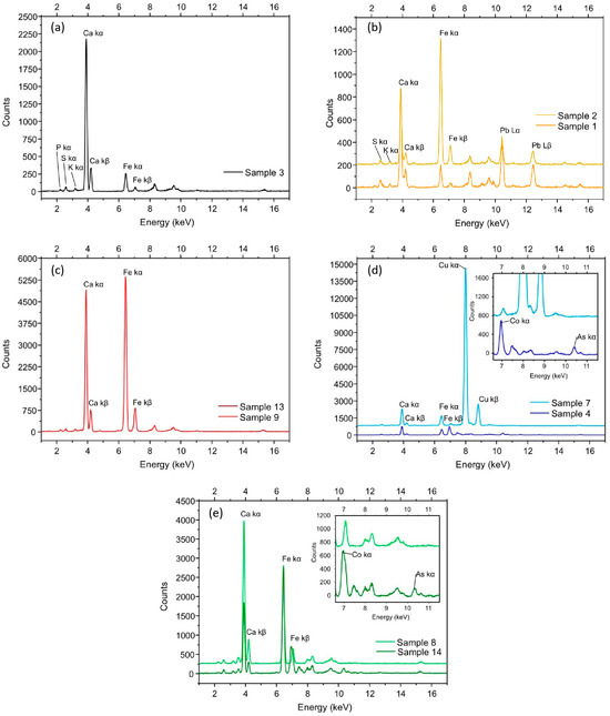 XRF spectra acquired on The Adoration of the Christ Child corresponding to: (a) the white area corresponding to sample 3, (b) the yellow areas corresponding to samples 1 and 2, (c) the red area corresponding to sample 9, (d) the blue areas corresponding to samples 4 and 7 and (e) the green areas corresponding to samples 8 and 14. Insets in (d, e) show the 6.5–11.5 keV range enlarged to highlight characteristic elemental peaks.
