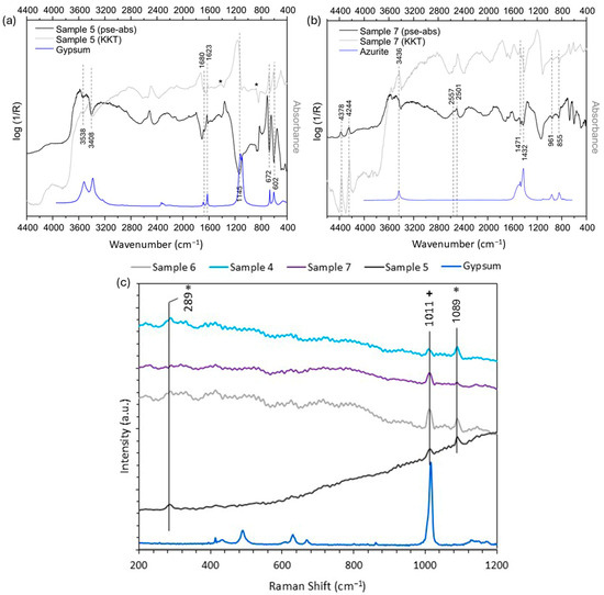 ER-FTIR spectra in external reflection mode (black) and after KKT correction (grey) acquired on The Adoration of the Christ Child for: (a) the white area corresponding to sample 5, with marker bands for gypsum (dotted lines) and for calcium carbonate (asterisks), reference spectrum of gypsum (blue) is shown for comparison; (b) the blue area corresponding to sample 7, with marker bands for azurite (dotted lines), reference spectrum of azurite (blue) is shown for comparison. (c) Raman spectra of samples 4, 5, 6 and 7 showing the presence of calcite (*) and gypsum (+), reference spectrum of gypsum (blue) is shown for comparison. The reference spectra displayed in each graph are taken from the laboratory’s internal database.