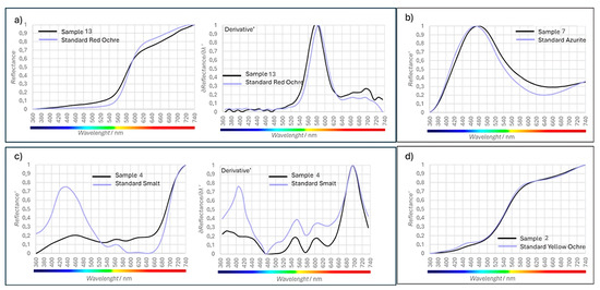 Visible reflectance spectra acquired on selected areas of The Adoration of the Christ Child, compared to the respective normalised spectra of the standard pigments: (a) sample 13, red on the small figure on the left, (b) sample 7, blue on Mary’s mantle, (c) sample 4, blue on Joseph’s robe and (d) sample 2, yellow on Joseph’s mantle.