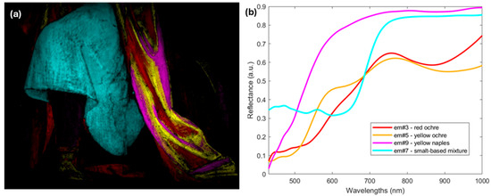 The spectra of the red and yellow endmembers reported in Figure 10b and Figure 11b can be related to ochre pigments, consistent with the red and yellow pigments previously found in The Marriage of the Virgin. In addition, a different endmember (em#9) is found in lighter areas of Joseph’s mantle along with yellow ochre, as shown in the distribution map of Figure 10a. The reflectance spectrum in the visible-to-near-infrared (VIS-NIR) region is different from that of yellow ochre, displaying fewer spectral features. Unlike yellow ochre, this spectrum is characterized solely by a steep absorption edge around 510 nm (Figure 10b). Consequently, the identification based on the VIS-NIR spectral range remains challenging, although the presence of Pb and Sb detected by XRF suggests the presence of a Pb-Sb yellow, such as Naples yellow [41].