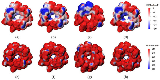 Distribution of ESP (isovalue = 0.001 a.u.) and ALIE (isovalue = 0.0005 a.u.) on the surface of ZIF-67 molecules under different surroundings. (a,e): vacuum; (b,f): ethanol; (c,g): DMF; (d,h): water.