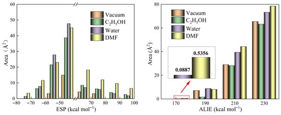 To accurately assess the two reaction processes of ZIF-67 molecules in various solvent environments, ESP and ALIE analysis are meticulously carried out, respectively. Here, ESP precisely describes the interaction energy between a unit positive charge located at a specific point r and the existing system. Regions with a relatively more positive (or more negative) electrostatic potential are generally regarded as more likely to attract the attack of nucleophilic (or electrophilic) reagents, thus effectively initiating a reaction. ALIE, on the other hand, refers to the average energy required for a molecule to lose an electron at a particular position. Notably, the lower this value is, the weaker the binding of electrons at this location becomes, and consequently, the more likely these electrons are to participate in electrophilic reactions. Both ESP and ALIE can be accurately expressed by Equations (1) and (2), respectively.