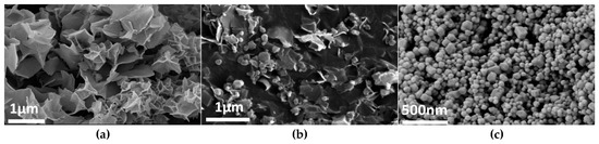 SEM images: m1 = 0.66, m2 = 0, t1 = 0.25, V1 = 15, (a) V1(C2H5OH):V1(H2O) = 85:15; (b) V1(C2H5OH):V1(H2O) = 70:30; (c) V1(C2H5OH):V1(H2O) = 50:50.