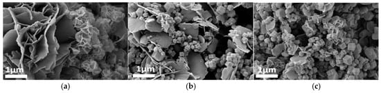 Figure 7, Figure 8, Figure 9 and Figure 10 present SEM images of ZIF-67 synthesized under varying parameters, including molar ratios of precursors (m1), transition layer volumes (V1), ethanol/water solvent ratios, and template agent (TBAB) loadings. As shown in Figure 7a, ZIF-67 synthesized with m1 = 0.66 exhibited a well-defined 2D nanoflower morphology. However, reducing the precursor ratio (m1 = 0.44 and 0.22) led to irregular granular structures (Figure 7b,c), highlighting the critical role of stoichiometric control in morphology development. Similarly, Figure 8, Figure 9 and Figure 10 demonstrate that optimizing the transition layer volume (V1 = 15), solvent composition (VC2H5OH:VH2O = 50:50), and TBAB loading (m2 = 0.5 g) significantly enhanced structural uniformity and porosity.