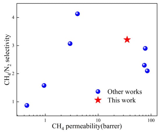 To evaluate the enhancement effect of ZIF-67nf on the membrane separation performance, MMMs with different loadings were prepared. Meanwhile, for the purpose of comparison, MMMs with the same loadings using 3D ZIF-67 as the filler were also prepared. The CH4/N2 separation performance is shown in Figure 13. When the ZIF-67nf loading in the MMMs reaches 20 wt%, the CH4 permeability coefficient increases steadily from 11.7 barrer to 35.3 barrer, while maintaining a CH4/N2 selectivity above 3. In contrast, MMMs incorporating 3D ZIF-67 particles show a more pronounced increase in CH4 permeability; however, this is accompanied by a sharp decline in CH4/N2 selectivity, highlighting the presence of significant interfacial defects in the membrane structure. This indicates that 2D-structured fillers possess significant potential advantages in enhancing interfacial compatibility within MMMs. Table 1 and Figure 14 compare the CH4/N2 separation performance of the polymeric membranes fabricated in this work with those reported in other studies, demonstrating promising potential when considering both permeability and selectivity.