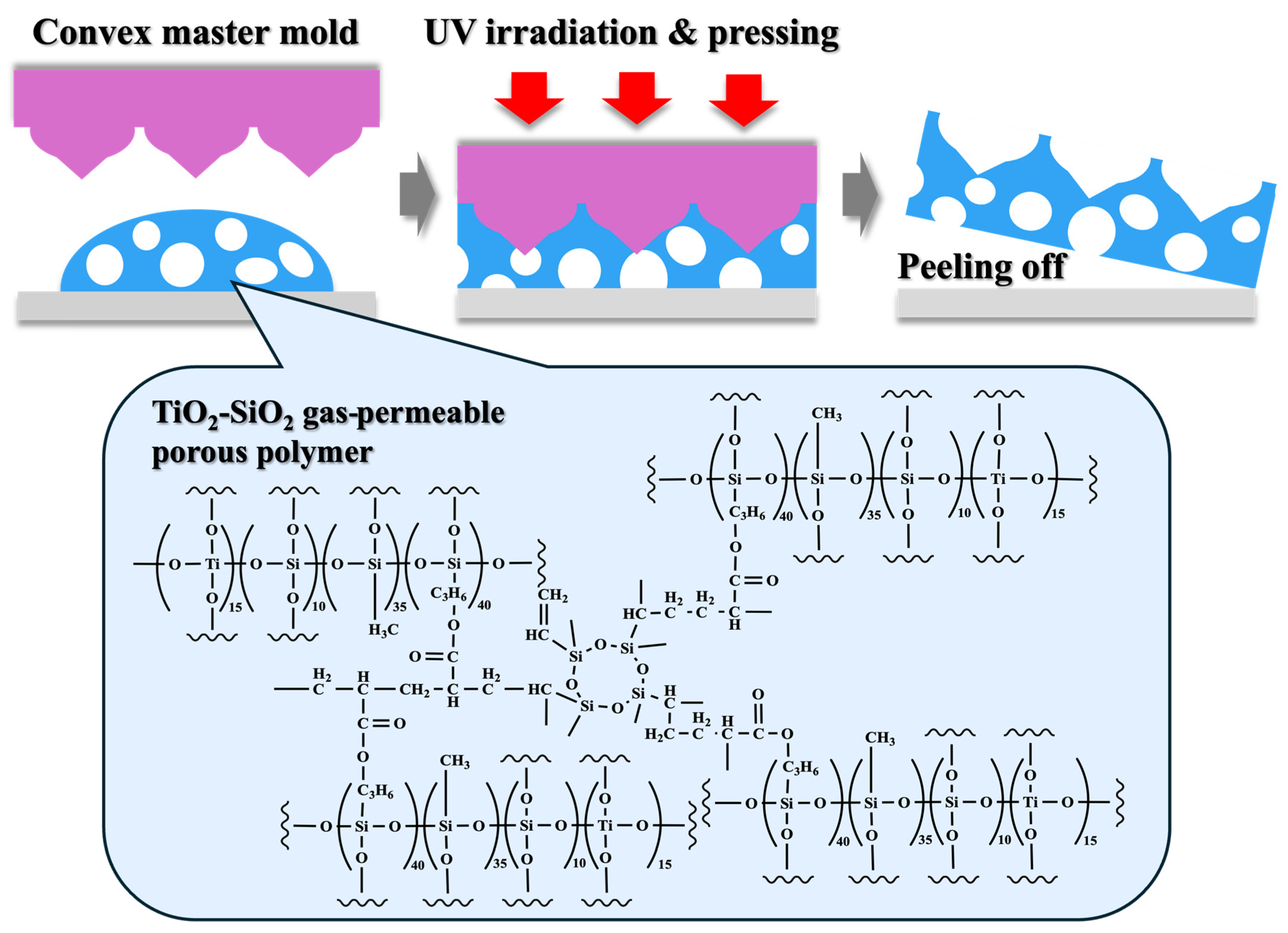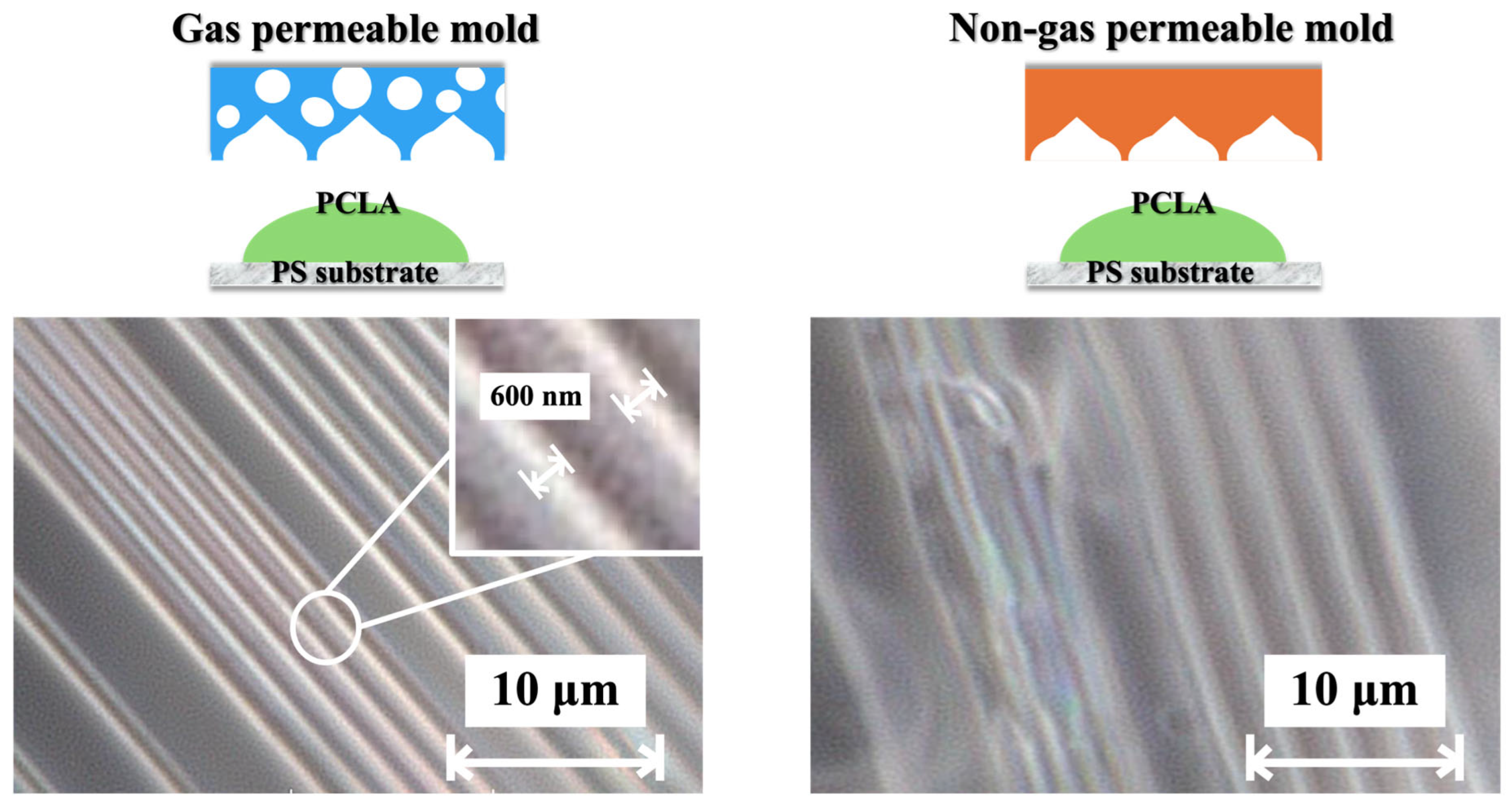 - Yamagishi, R.; Miura, S.; Ando, M.; Hachikubo, Y.; Murashita, T.; Sugino, N.; Kameda, T.; Kawano, Y.; Yasuda, K.; Takei, S. Nanoimprint Lithography for Collagen Micropatterning at Low-Temperature 5 °C with TiO2-SiO2 Gas-Permeable Porous Mold. J. Photopolym. Sci. Technol. 2024, 37, 457–463. [Google Scholar] [CrossRef]