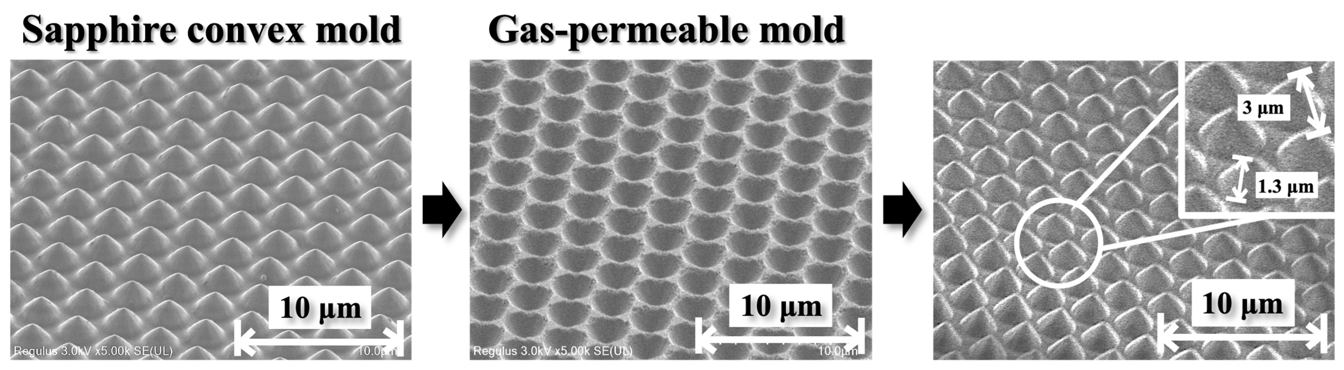 - Miura, S.; Yamagishi, R.; Sugino, N.; Yokoyama, Y.; Miyazaki, R.; Yasuda, K.; Ando, M.; Hachikubo, Y.; Murashita, T.; Kameda, T.; et al. Nanoimprint lithography and microinjection molding using gas-permeable hybrid mold for antibacterial nanostructures. J. Photopolym. Sci. Technol. 2023, 36, 183–190. [Google Scholar] [CrossRef]